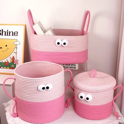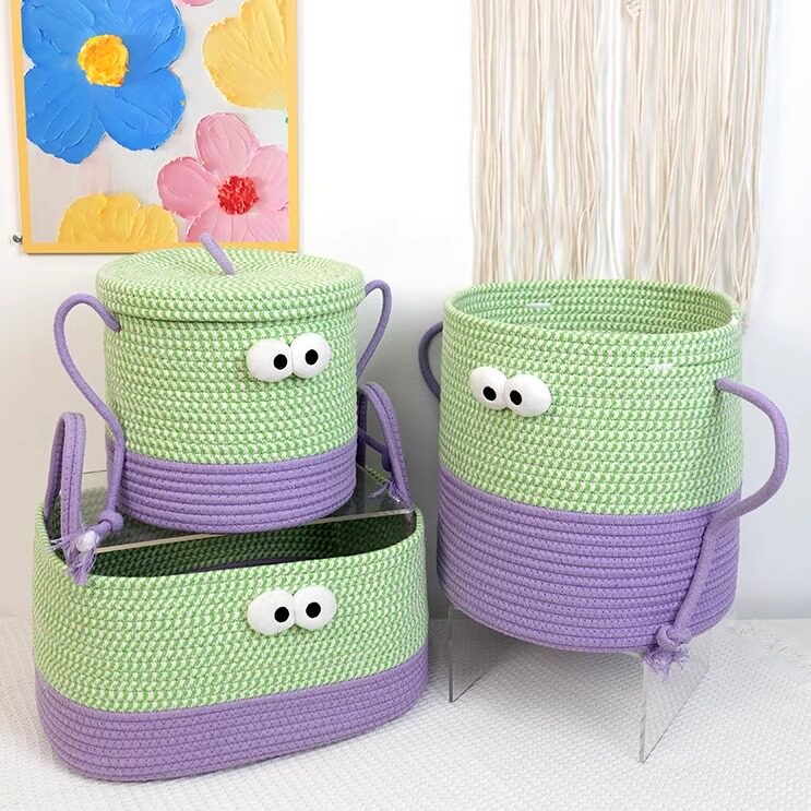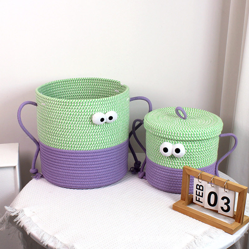 网红小怪兽卡通圆形收纳桶玩具桌面编织收纳筐带盖零食储物篮盒箱