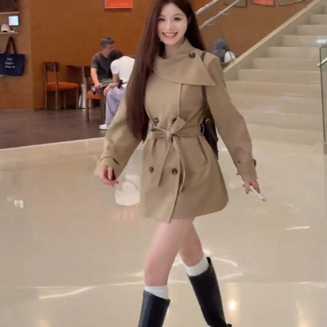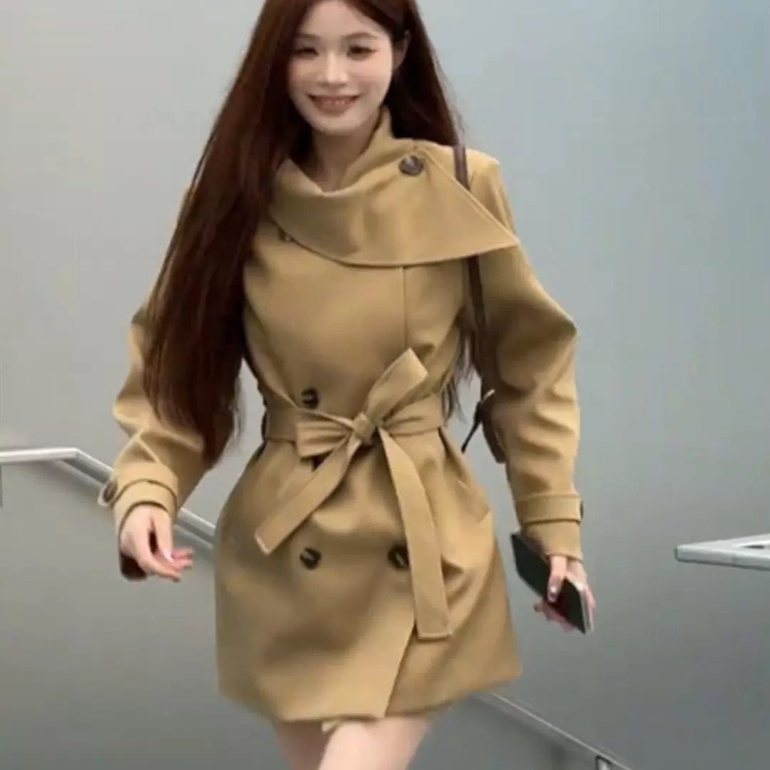 新款英伦风双排扣围脖领收腰中长款风衣外套女装短款小个子早秋季