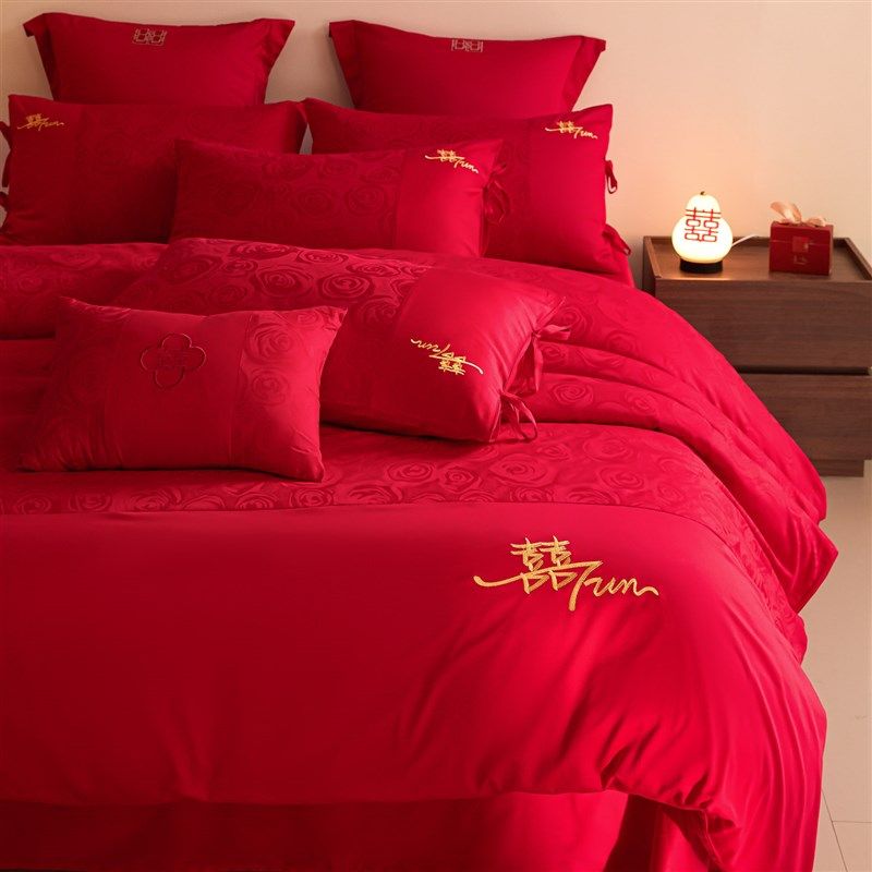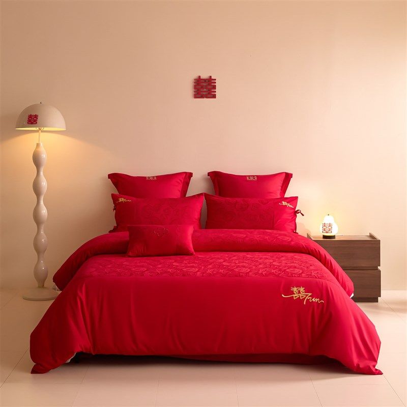 提花结婚床上四件套婚庆红色C全棉被套新婚房喜被床单婚礼