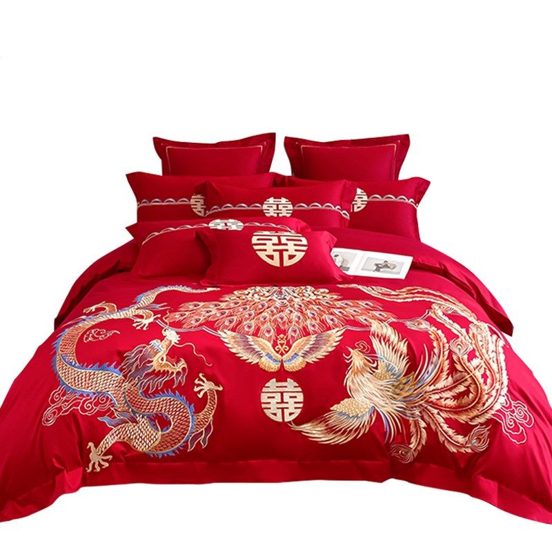 中式龙凤刺绣大红色婚庆s四件套新婚陪嫁结婚六件床单被套床上用