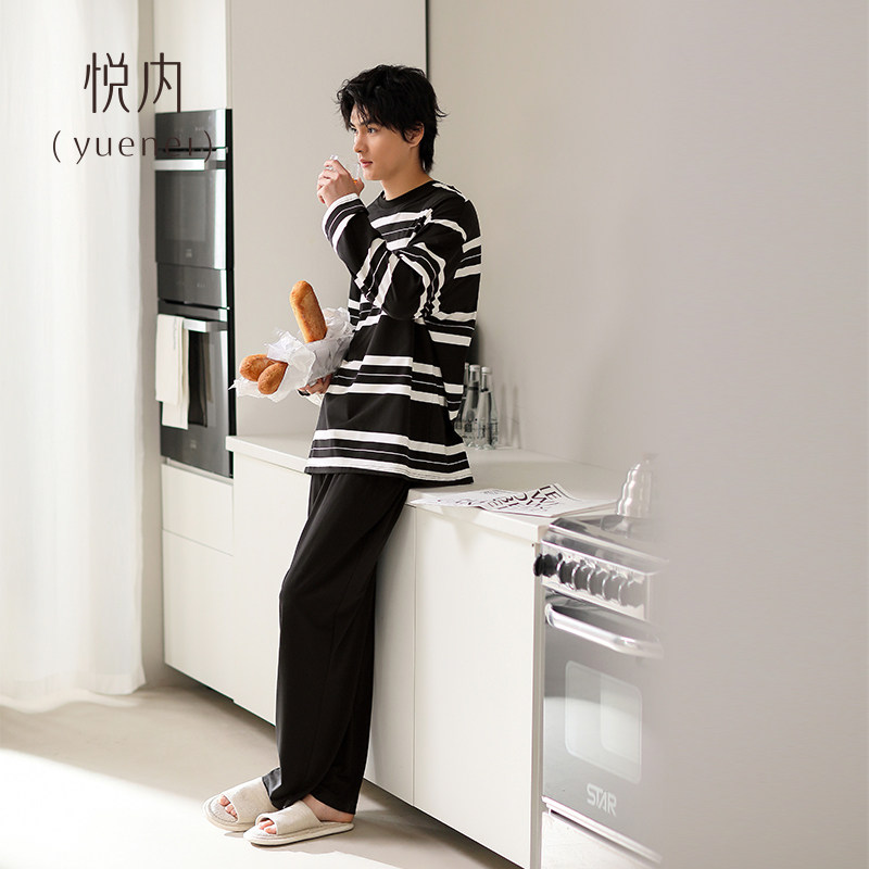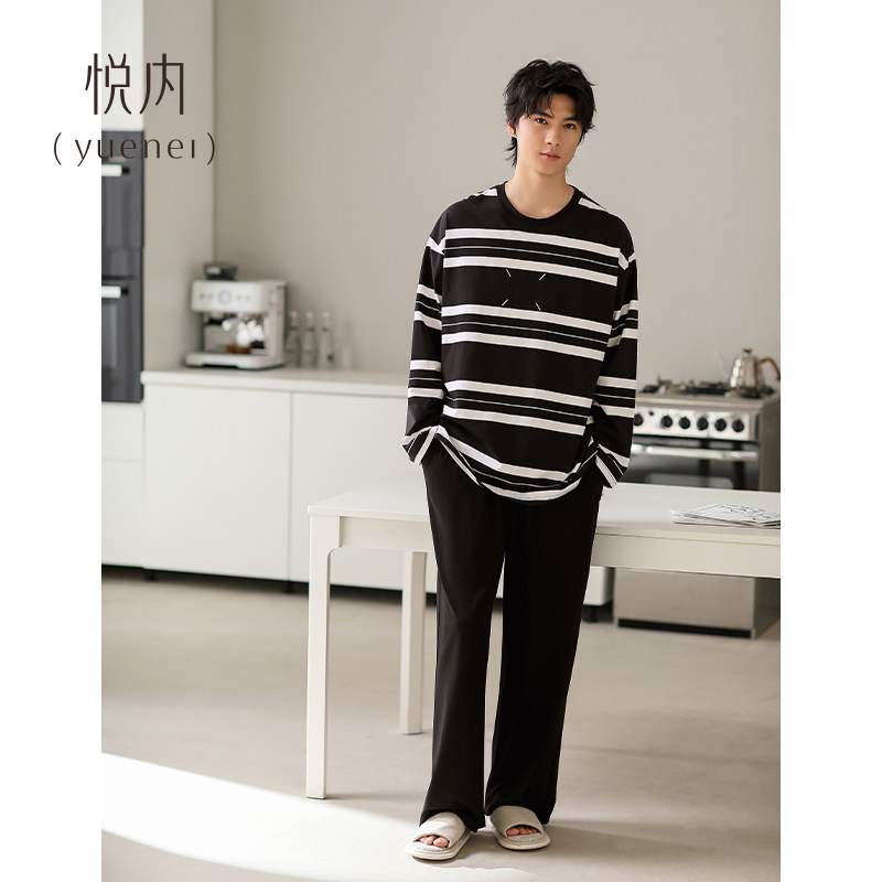 悦内睡衣男士春秋款纯棉长袖家居服加大码圆领套头黑白条纹可外穿