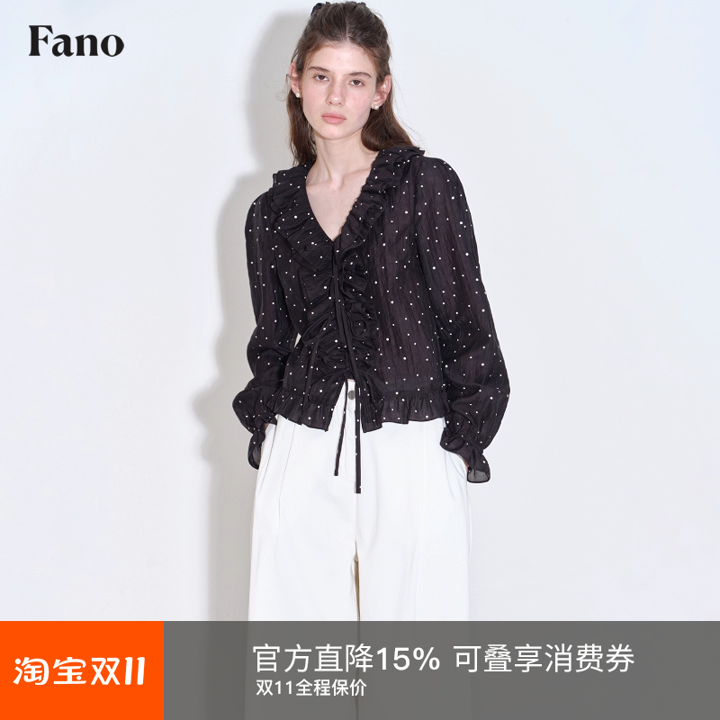 范洛Fano 俏皮波点印花浪漫荷叶边造型感灯笼袖V领衬衫女上衣秋季