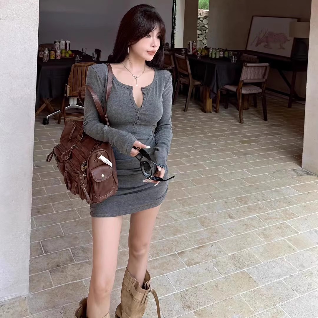 ALA辣妹短裙2025秋季新款洋气显瘦掐腰褶皱设计感v领长袖连衣裙女