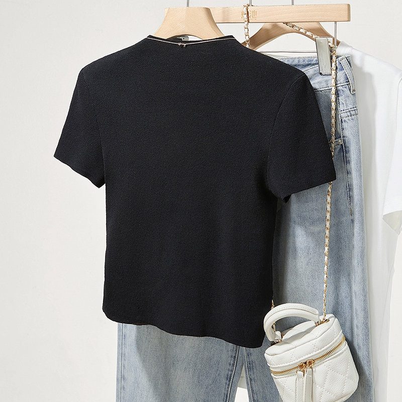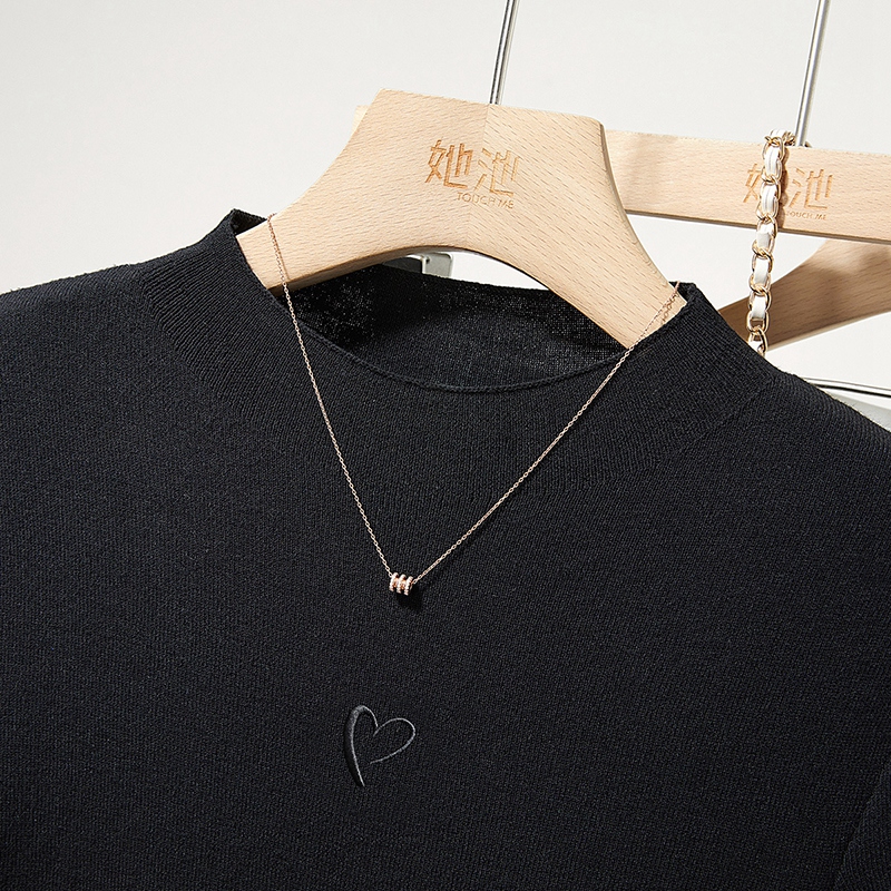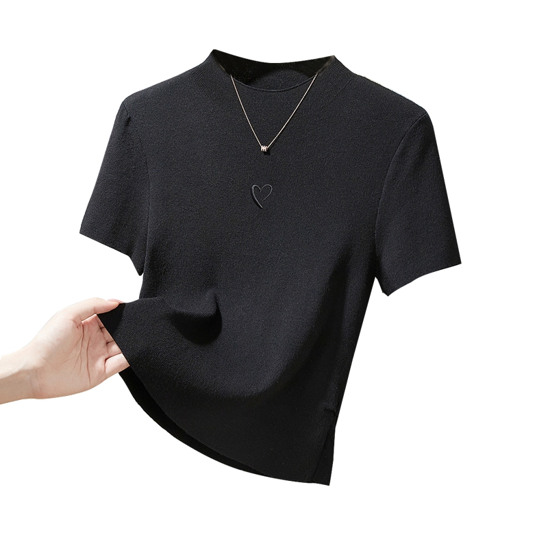 她池修身针织衫2025夏装新款女装半高圆领短袖爱心刺绣短款上衣