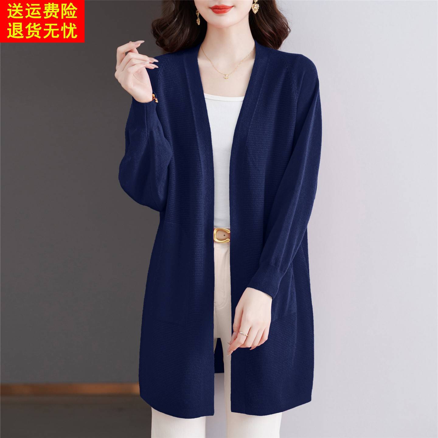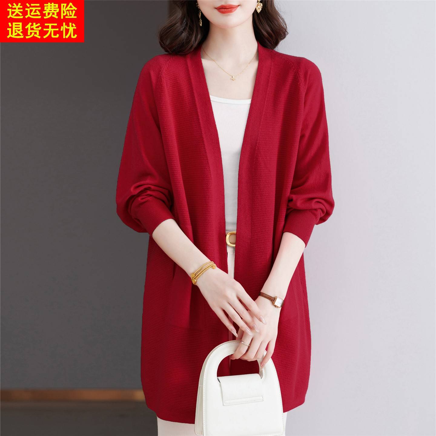 早秋玫红色慵懒风针织开 衫外套女中长版宽松薄款毛衣春秋外搭披