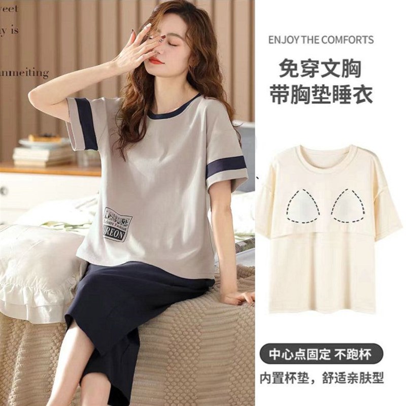 带胸垫睡衣女纯棉夏季新款短袖100%纯I棉七分裤家居服女士套装夏
