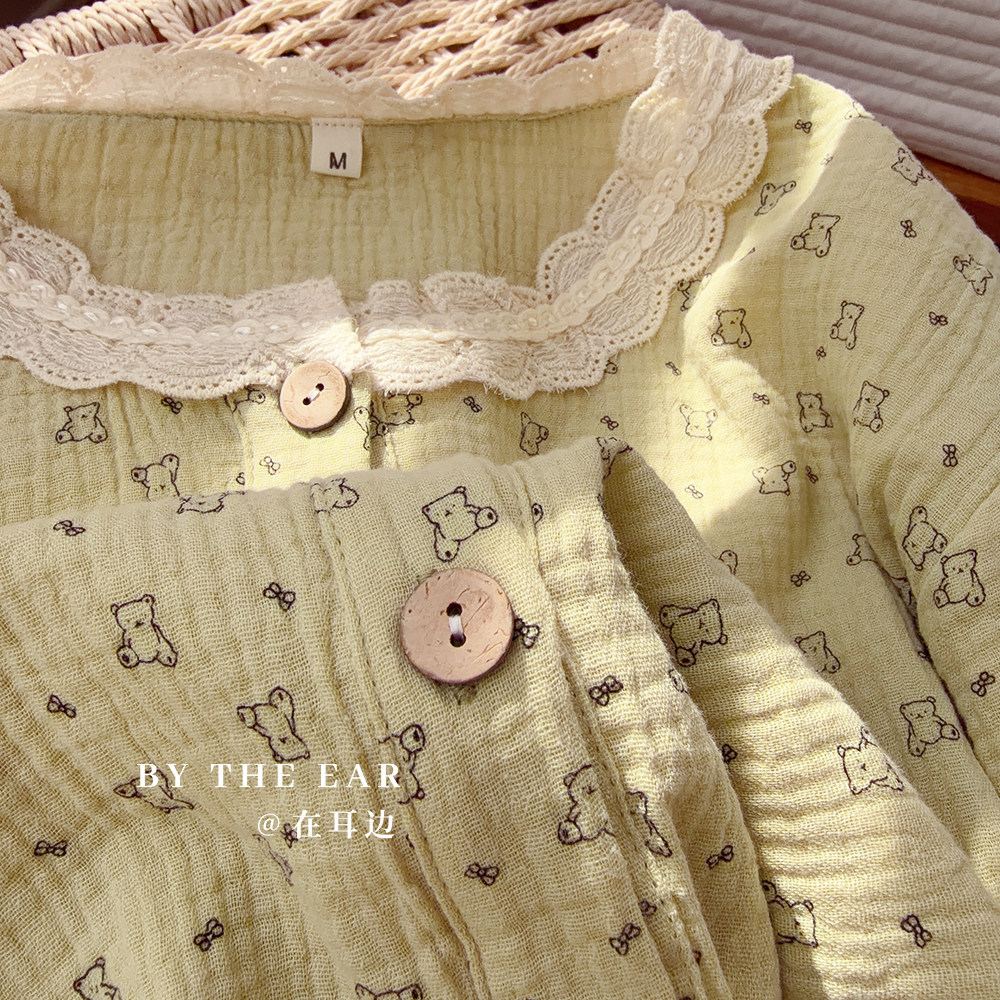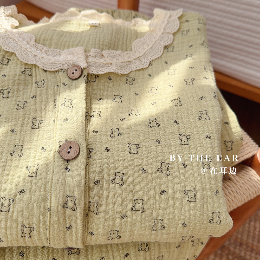 治愈系绿小熊纯棉双层纱布睡衣家居服长袖长裤套装清新女生春夏秋