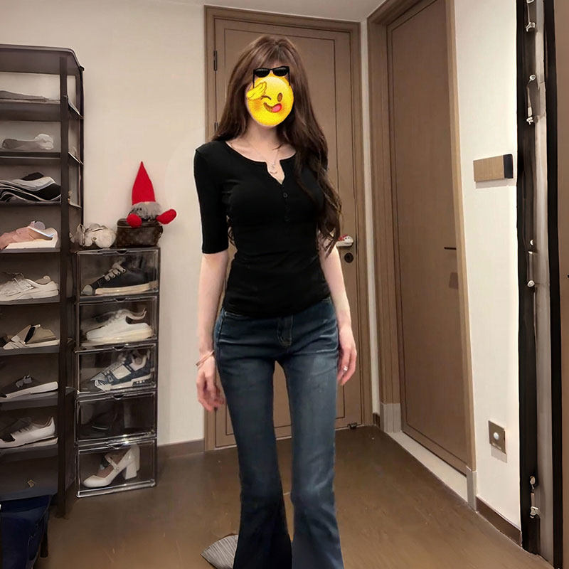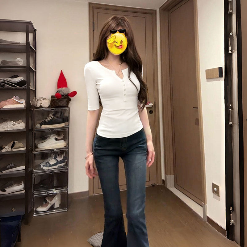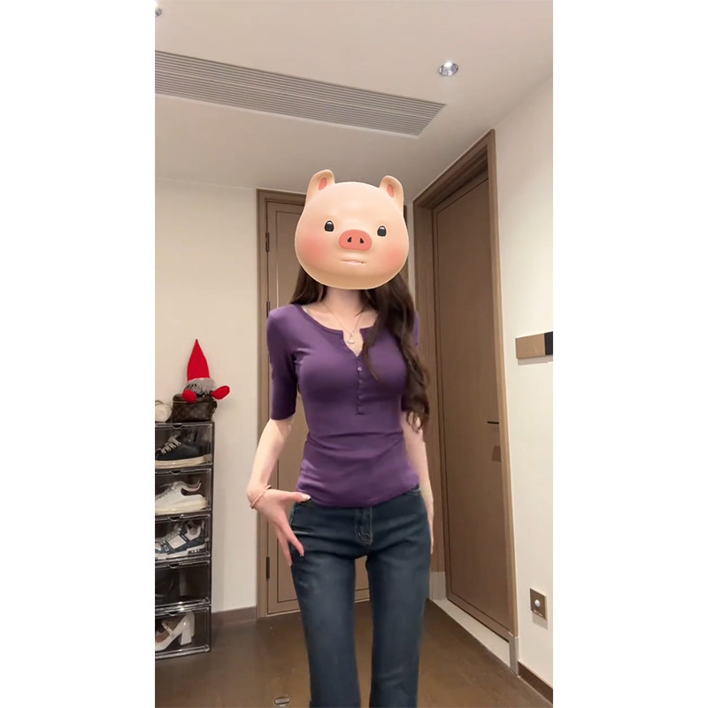 设计感小众正肩U领纯棉五分袖T恤女春夏辣妹短款修身显瘦半袖上衣
