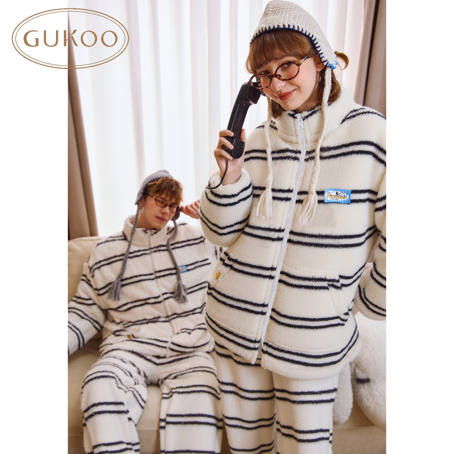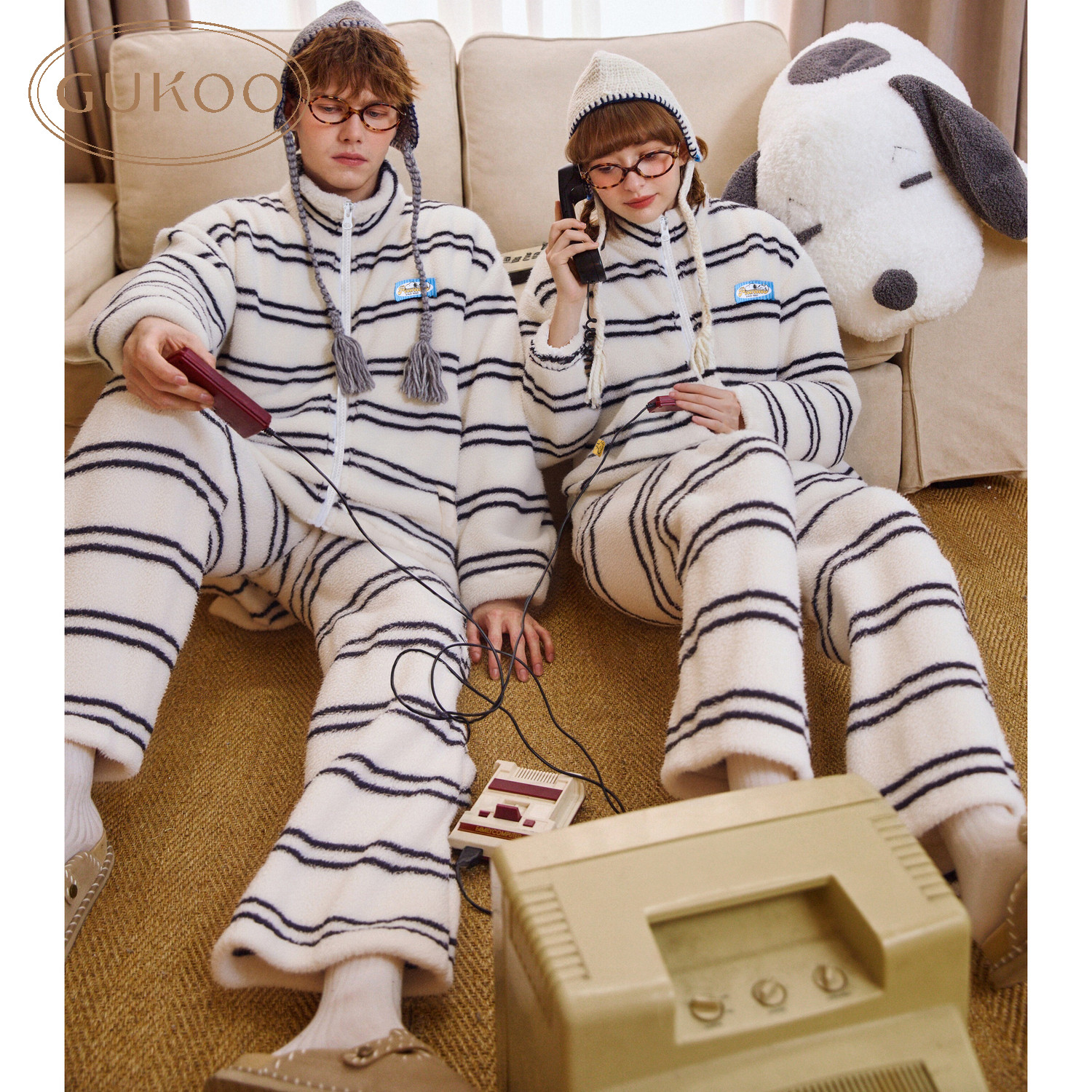 Gukoo/果壳情侣睡衣冬季毛绒保暖新款史努比联名条纹家居服套装D