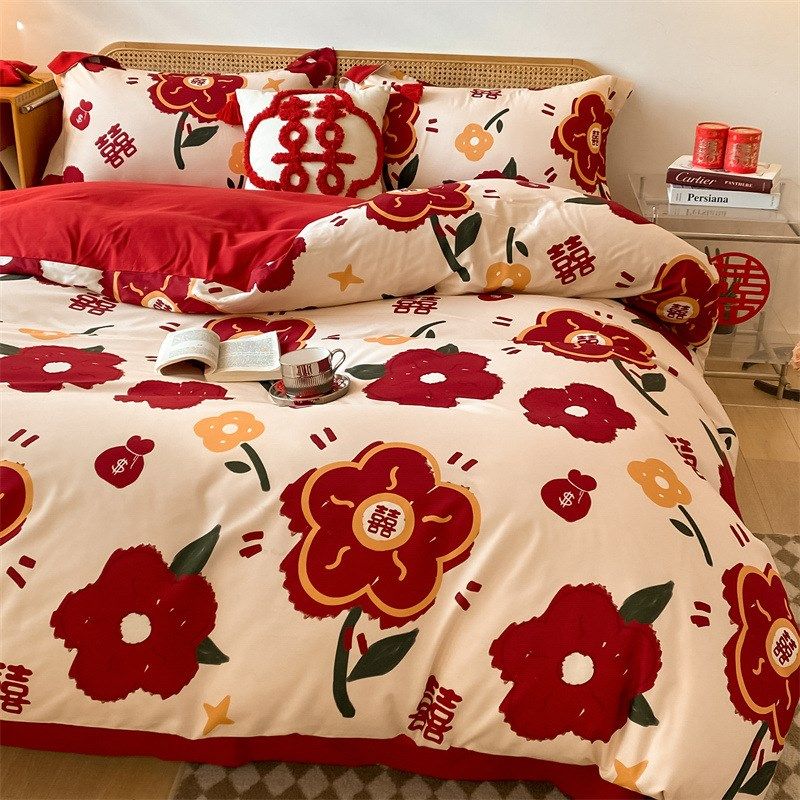 新婚水洗棉床上四件套结婚磨毛中式婚庆喜L被套陪嫁大红色床单床