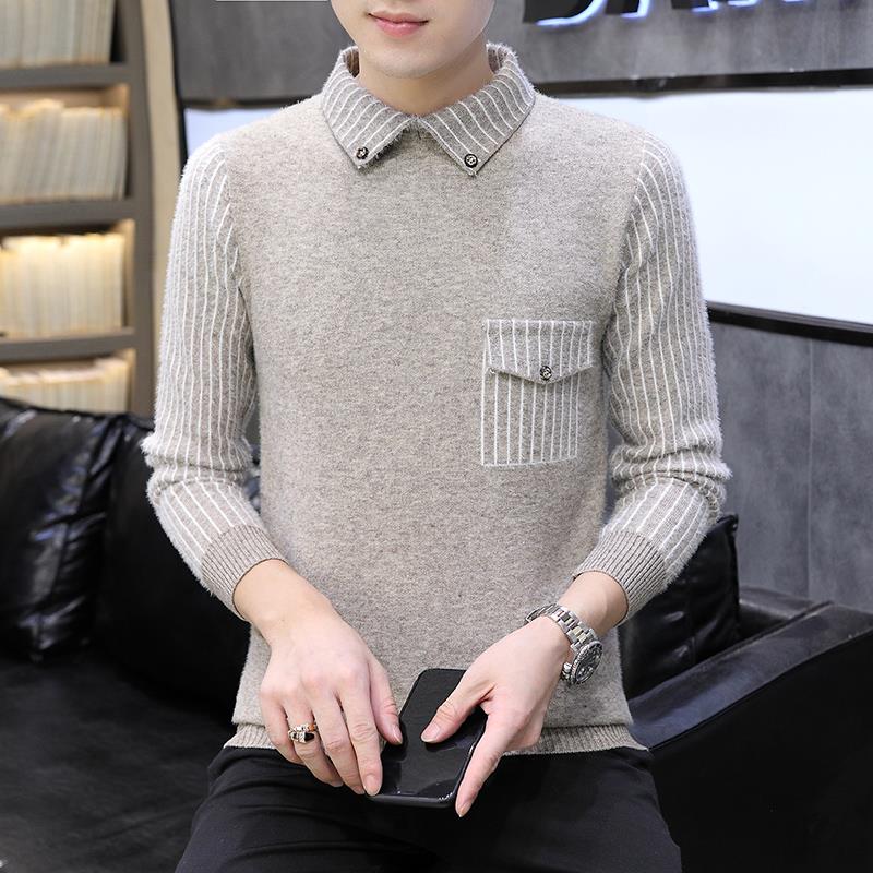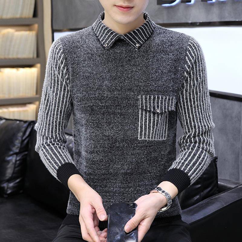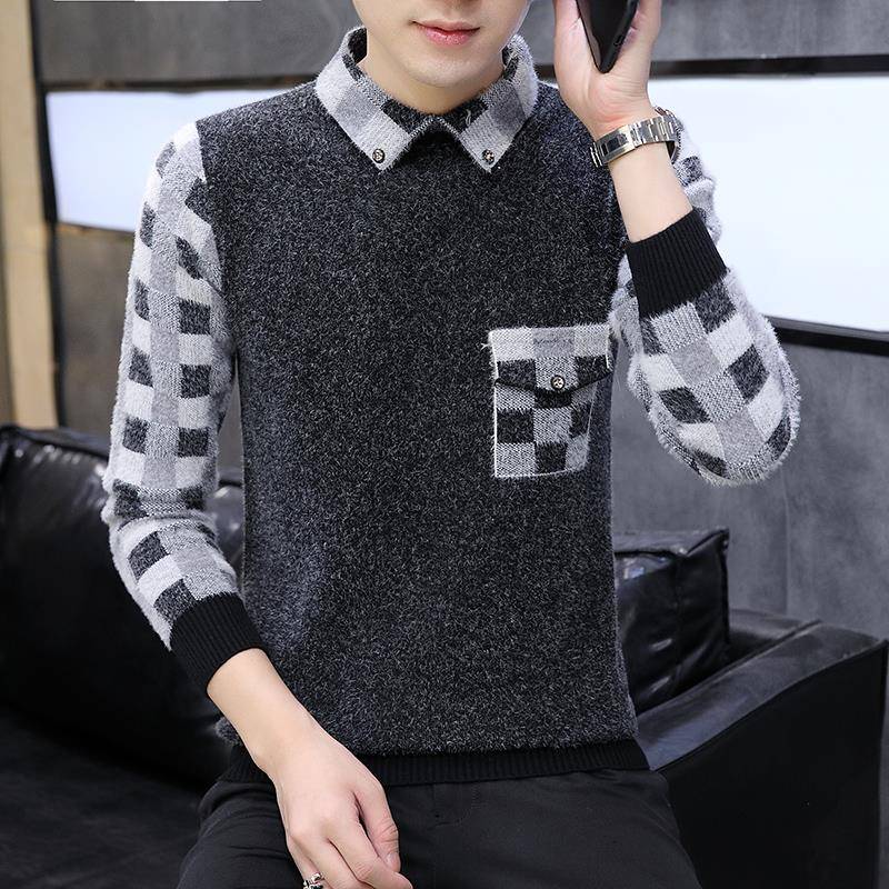 加绒假两件毛衣男士衬衫领加厚仿水毛衫线衣男装潮流秋冬背1010r