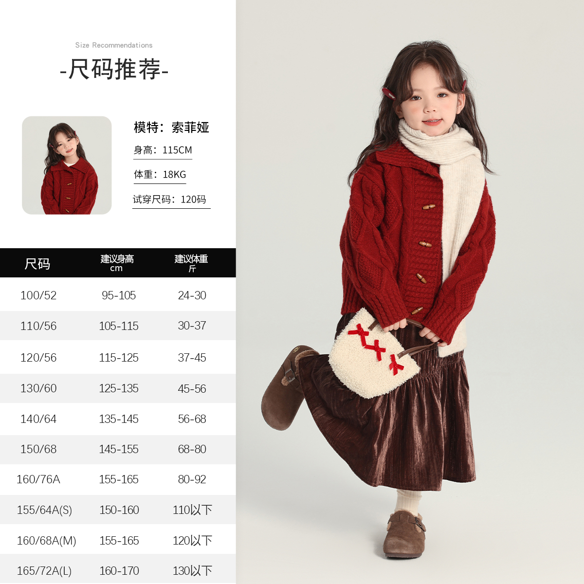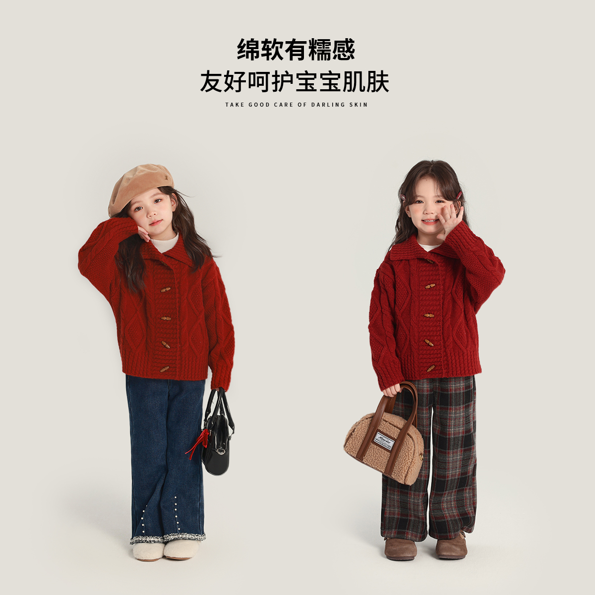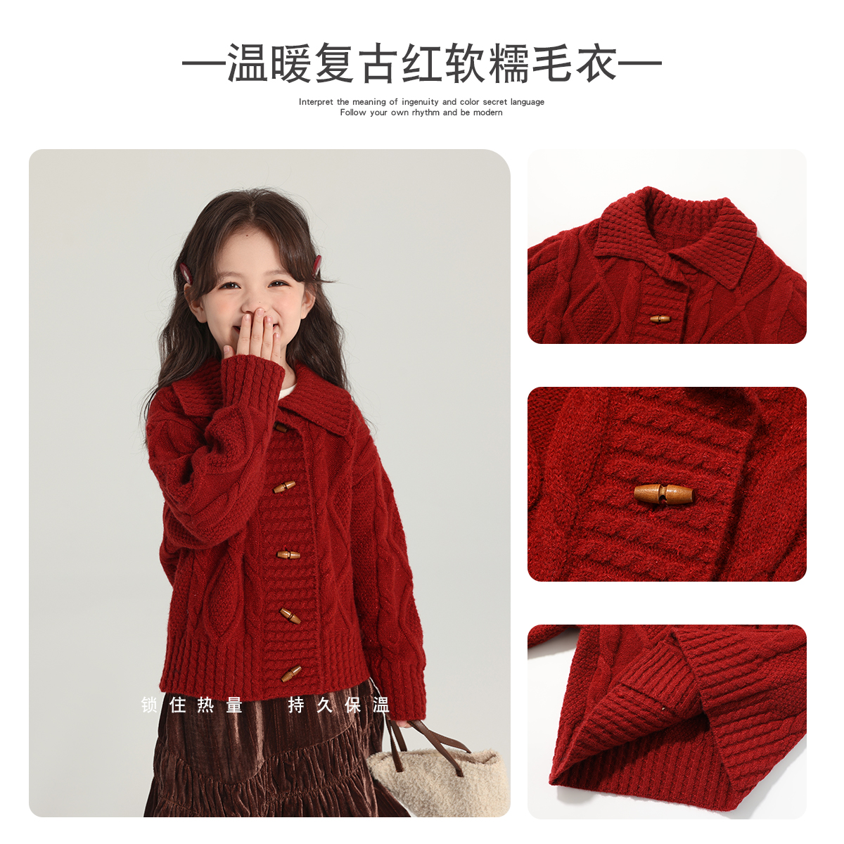 沫沫童装冬装女童拜年服2025季新款儿童加厚新年衣服红色开衫毛衣