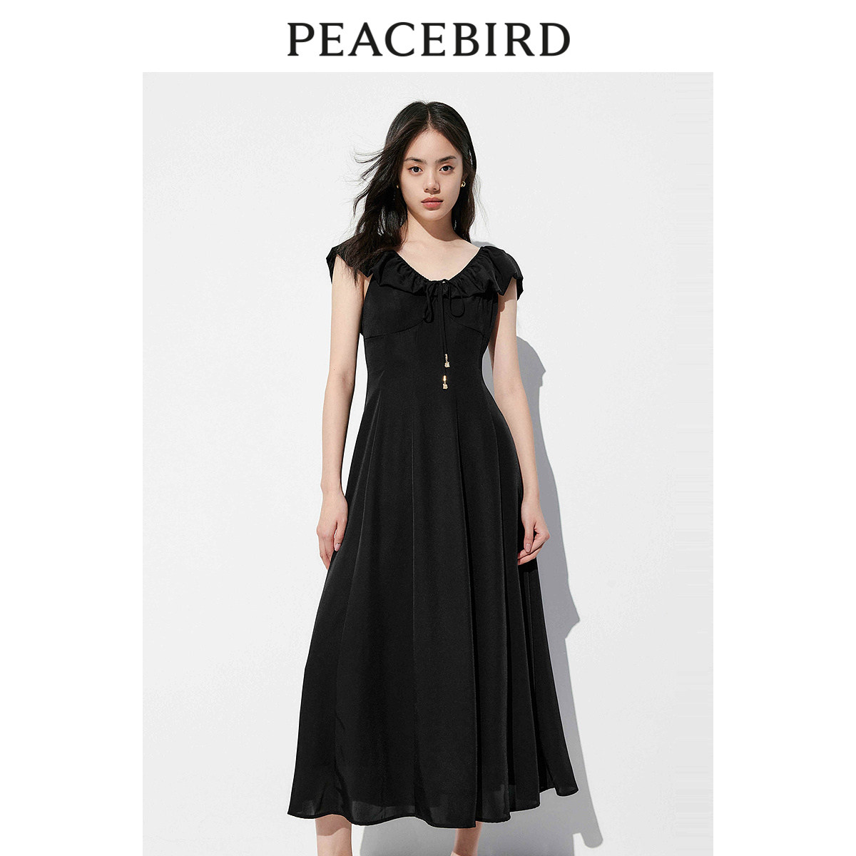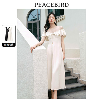 太平鸟女装法式度假连衣裙2025夏款小众一字肩纯色茶歇裙吊带裙