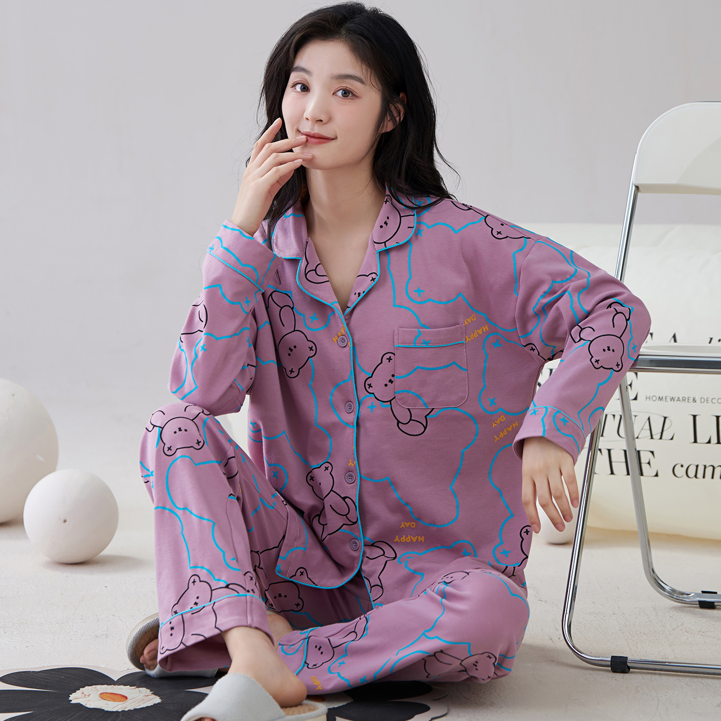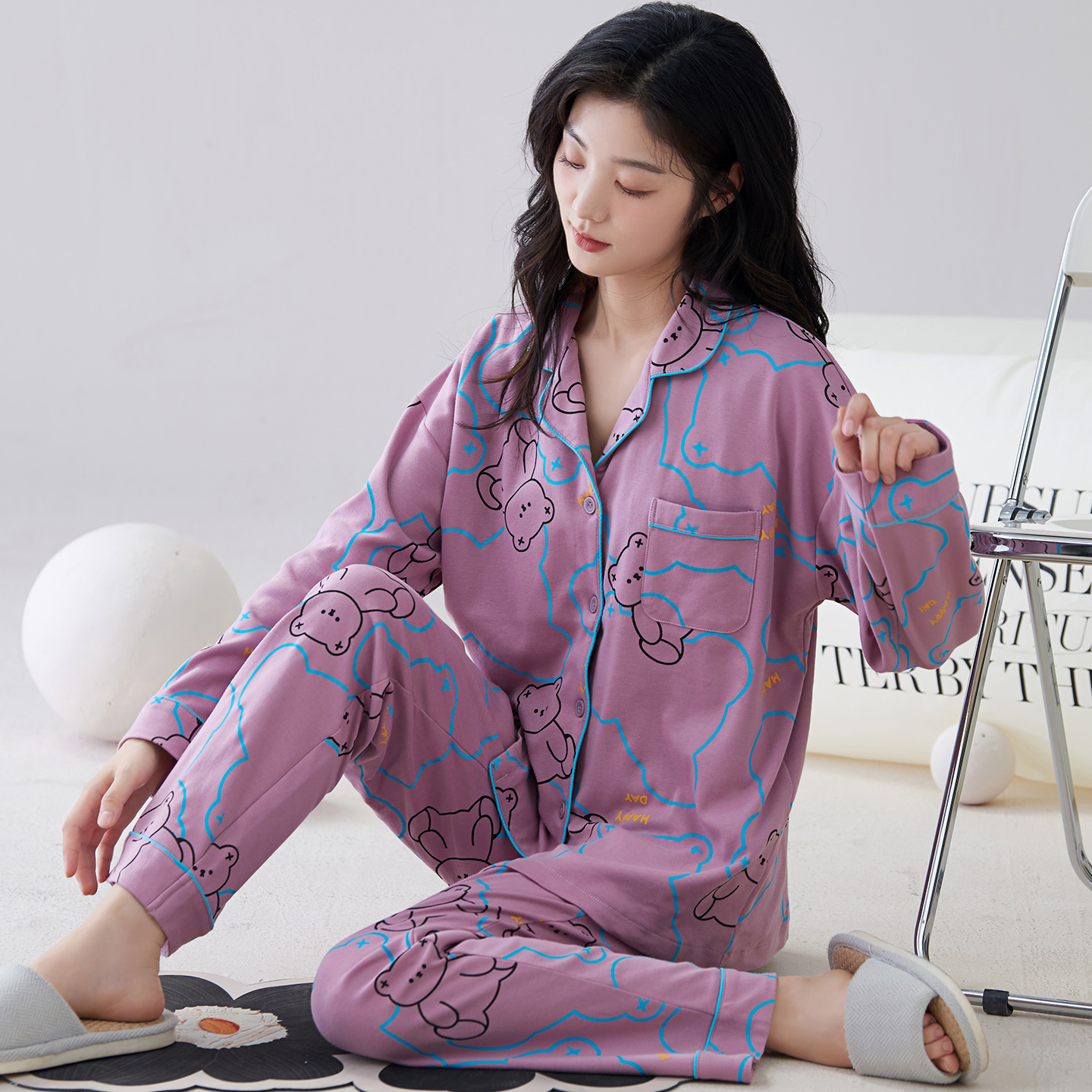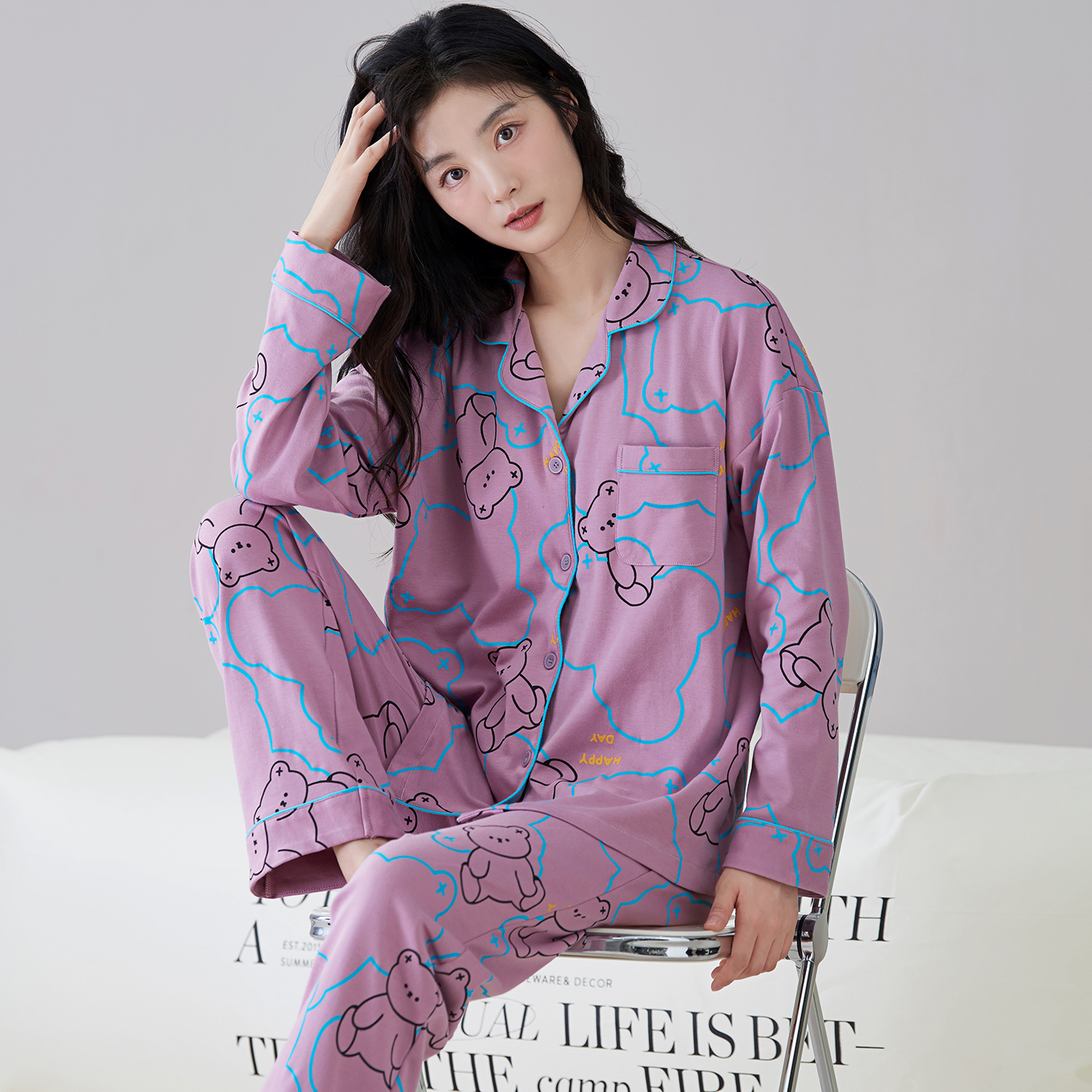 卡之恋睡衣女带胸垫长袖春秋季纯棉紫色卡通小熊印花可外穿家居服