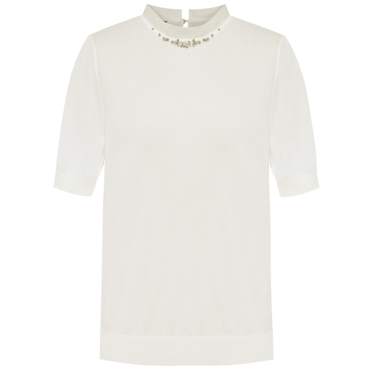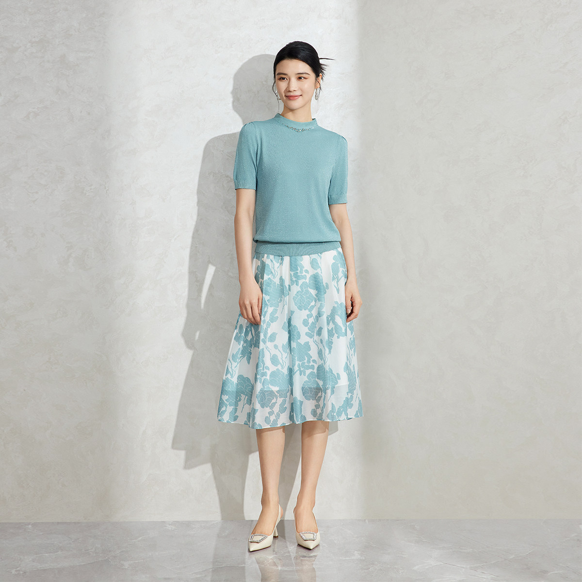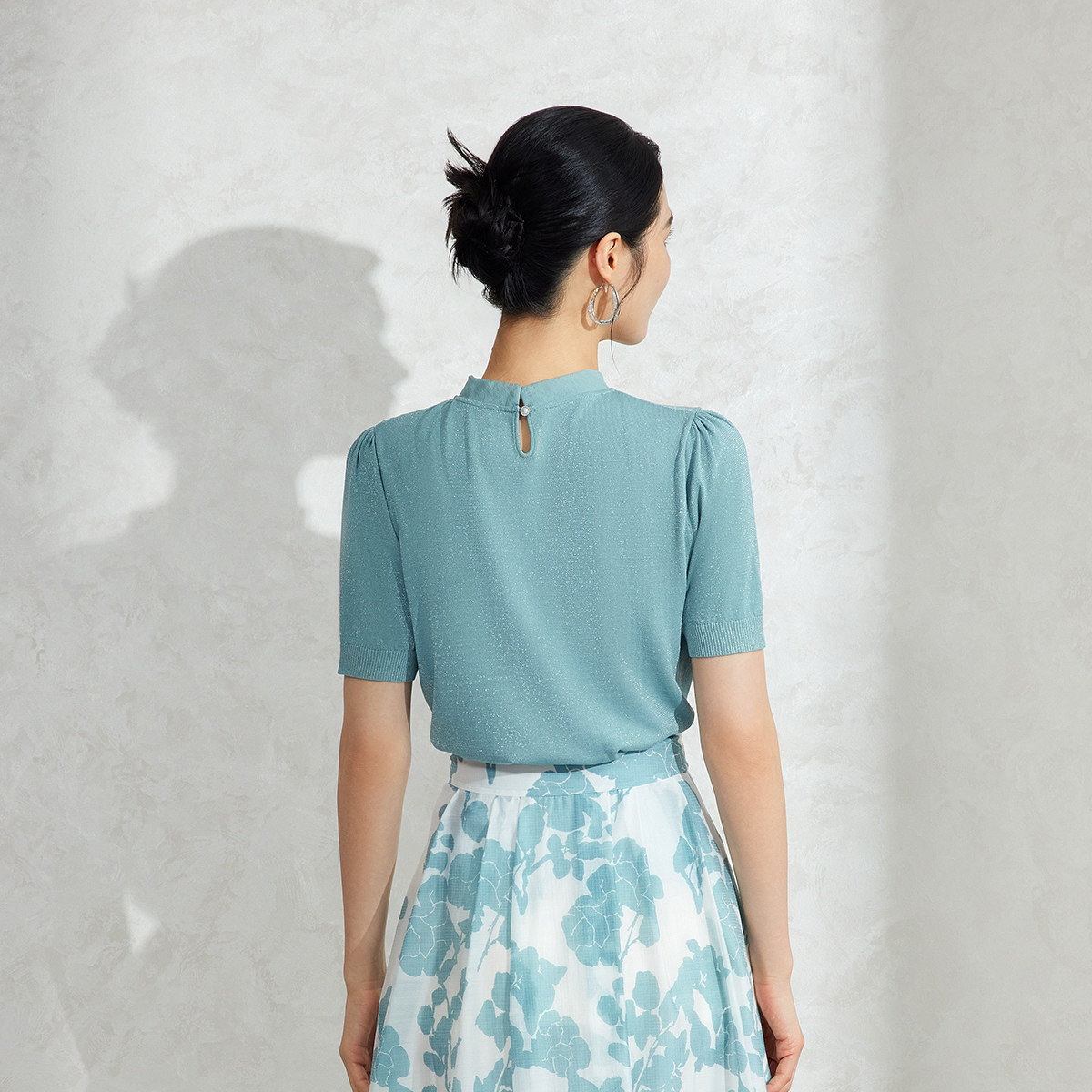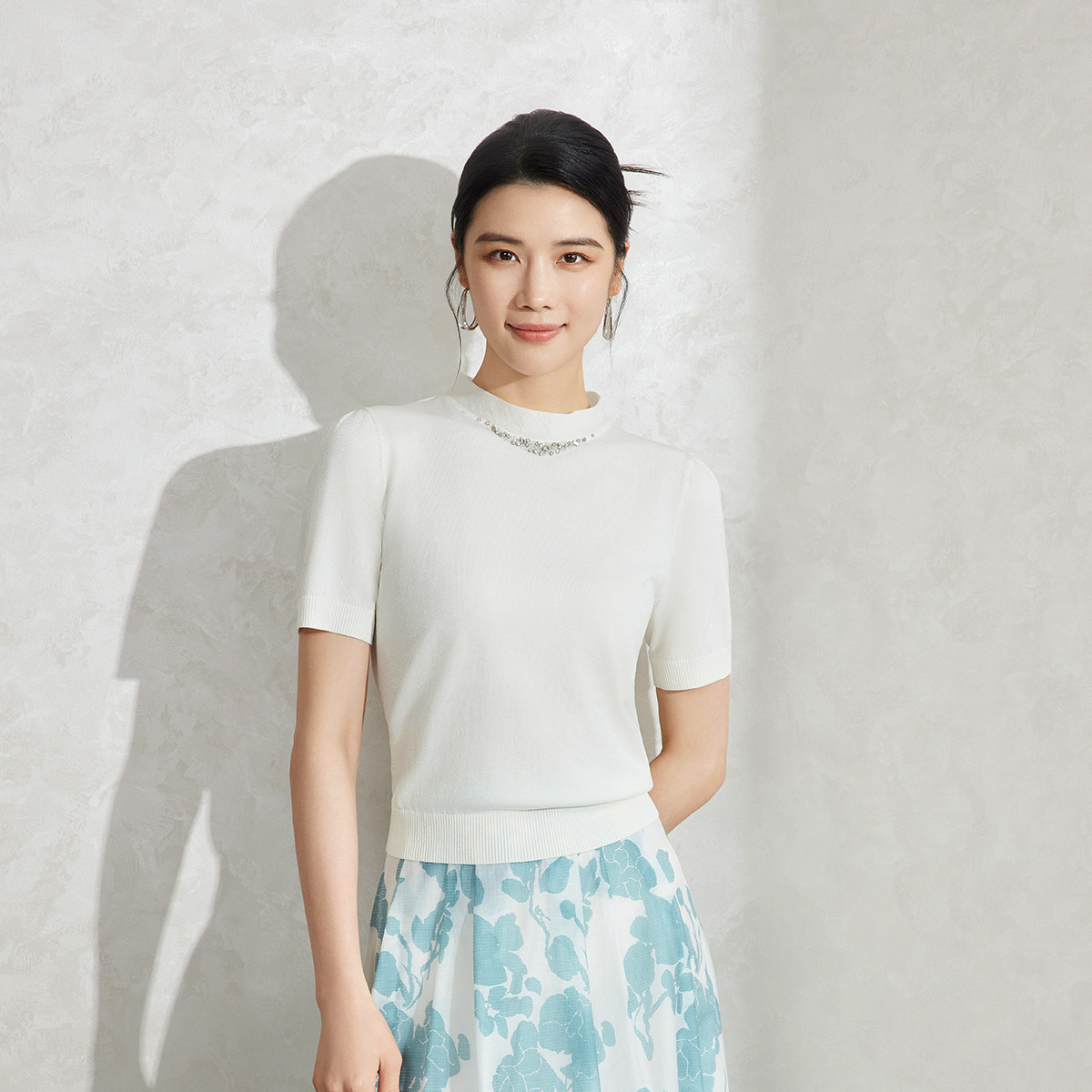 BBLLUUEE粉蓝衣橱2025早秋新款气质钉钻曲珠短袖针织衫女立领小衫