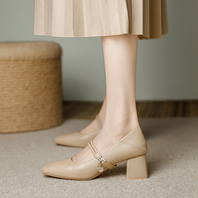 裸色方头粗跟一字带玛丽珍高跟鞋