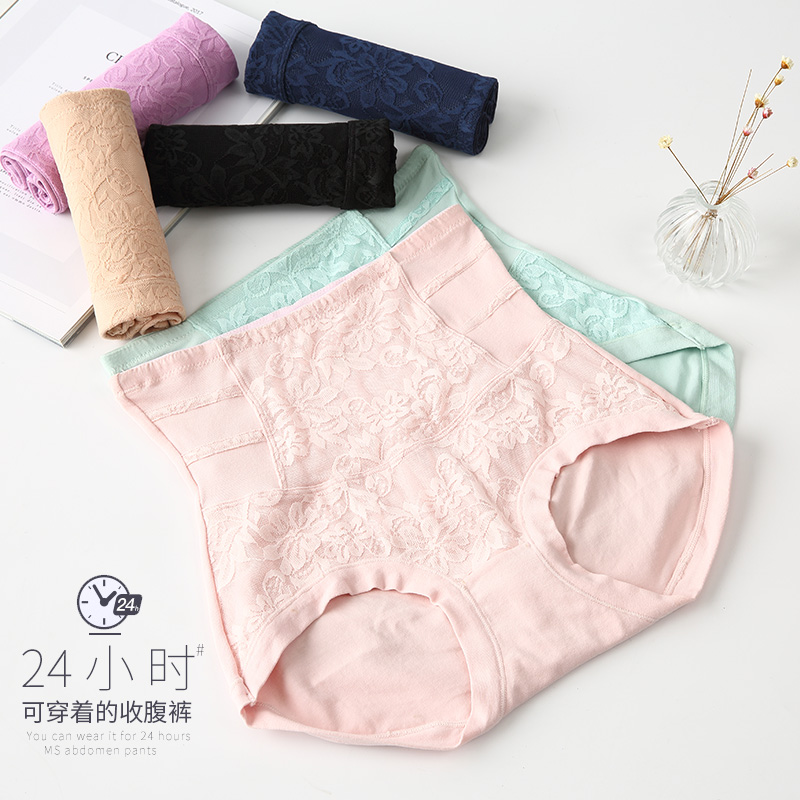 月色4条装夏薄女士收腹内裤胖mm蕾丝高腰提臀大码产后塑身三角裤