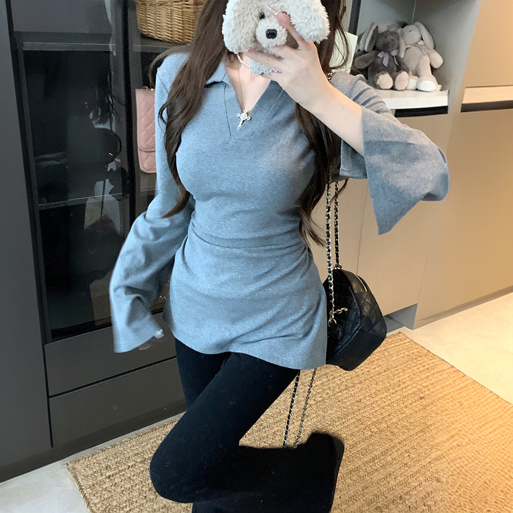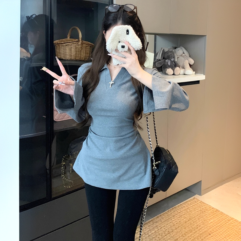 特大码胖mm辣妹风显瘦喇叭袖Polo领长袖t恤女超好看独特漂亮上衣