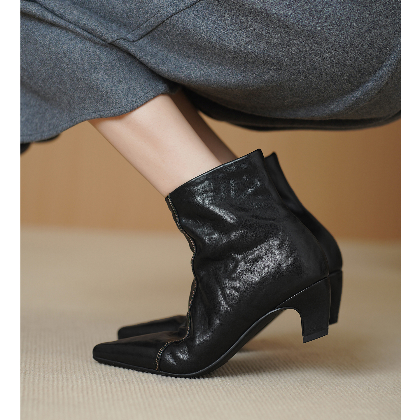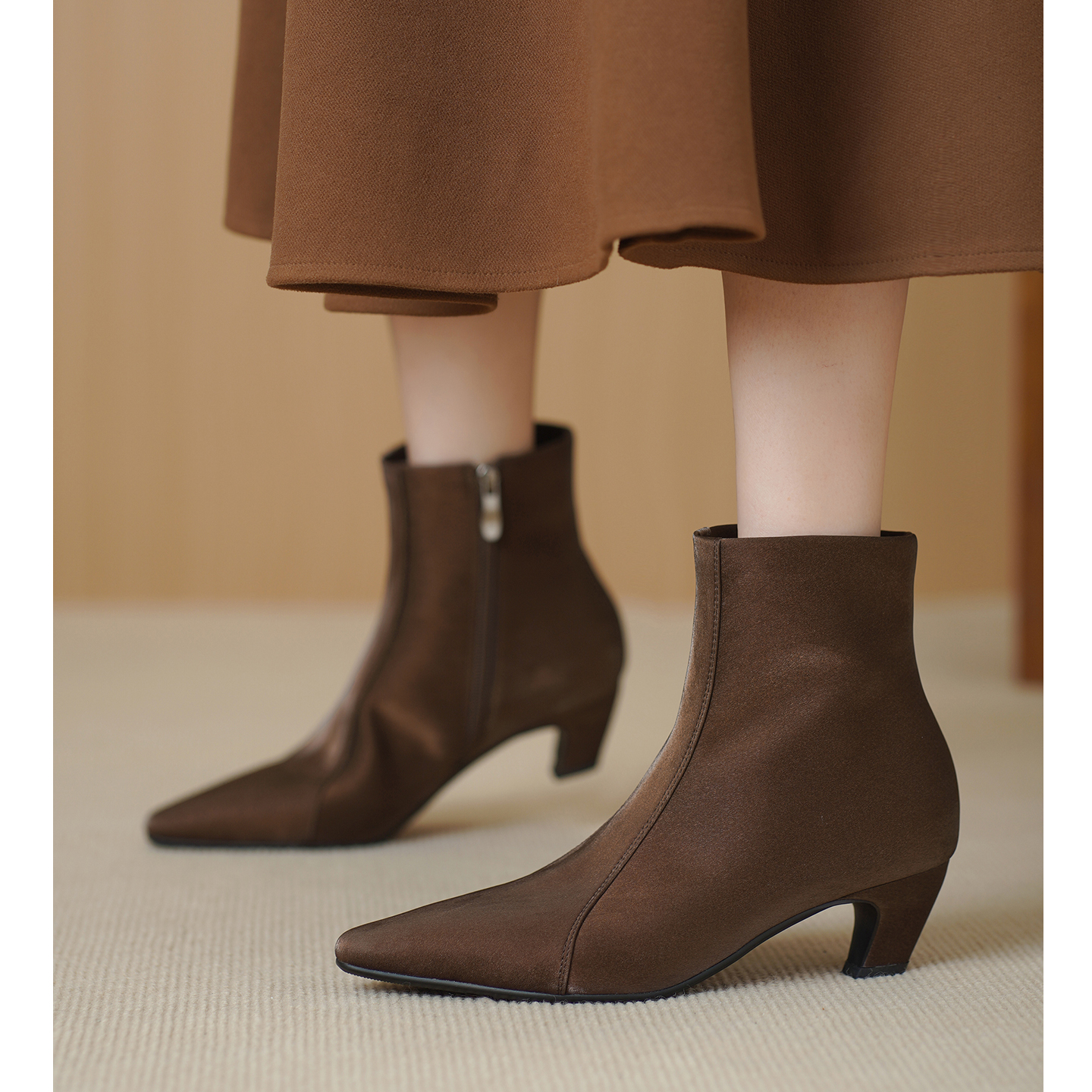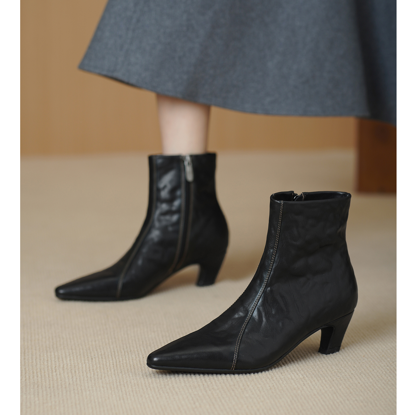 Kmeizu法式中古~5cm粗跟短靴女尖头简约商务静音及踝高跟鞋马丁靴