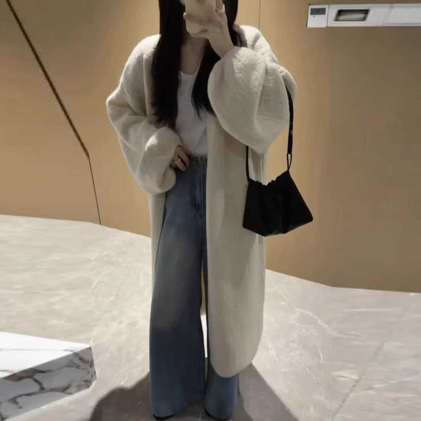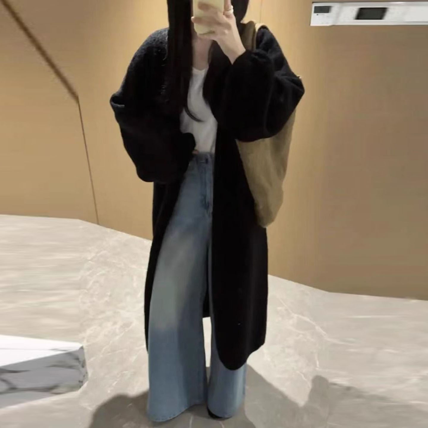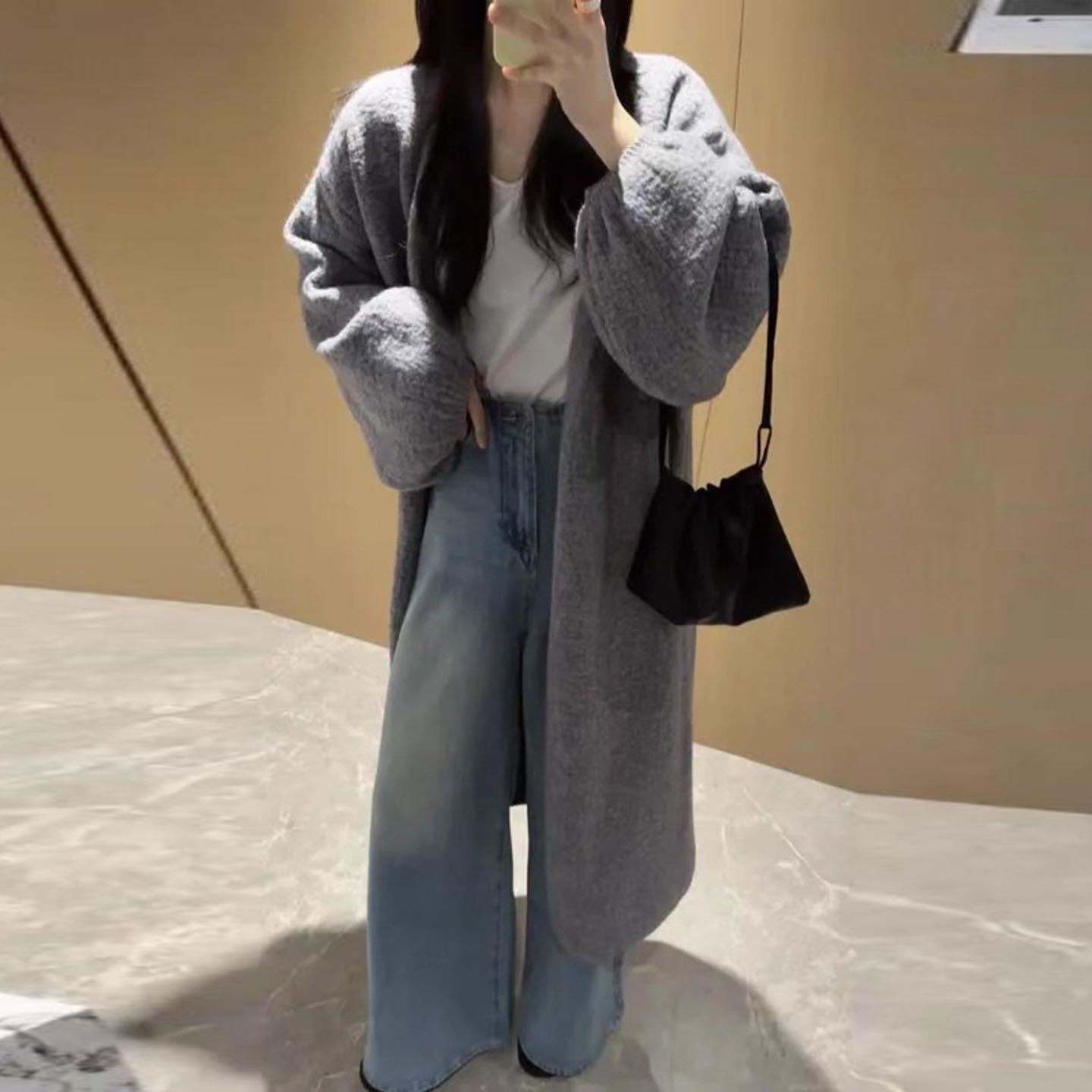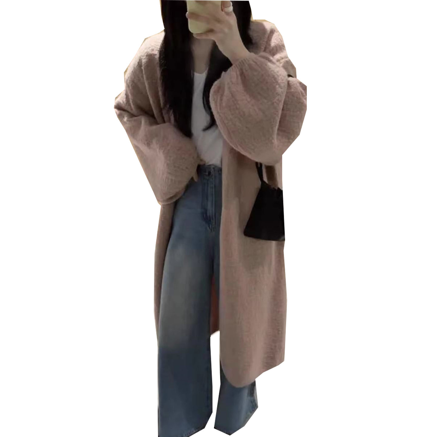 韩系甜美慵懒风大灯笼袖毛衣开衫女树皮纹秋冬中长款针织外套气质