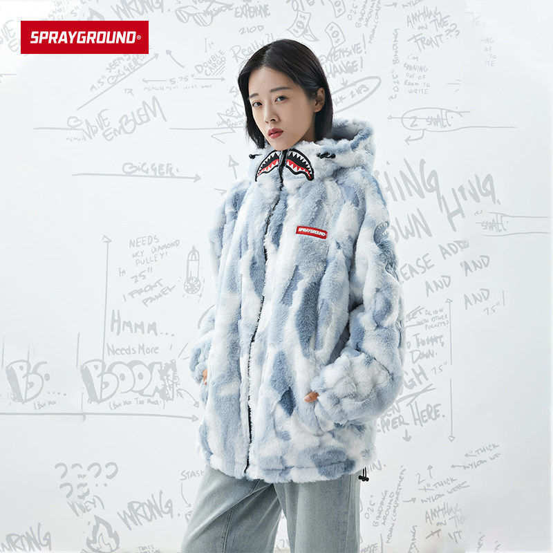 SprayGround不规则花纹毛毛棉服外套秋冬鲨鱼嘴男女情侣迷彩棉服