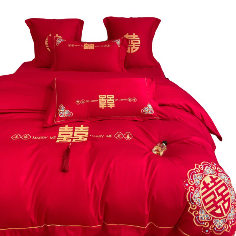 中式喜字结婚四件套大红色床单被套婚庆床上用品婚房喜被