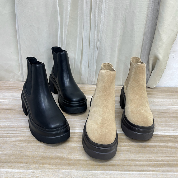 外贸原单女靴真皮新款时尚百搭圆头纯色厚底粗跟松糕切尔西短靴