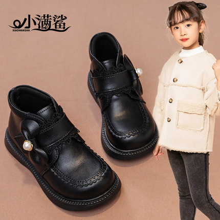 小满鲨女童棉鞋真皮公主靴子秋冬新款儿童皮鞋软底小宝宝黑色皮靴