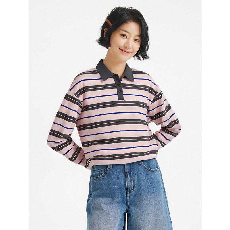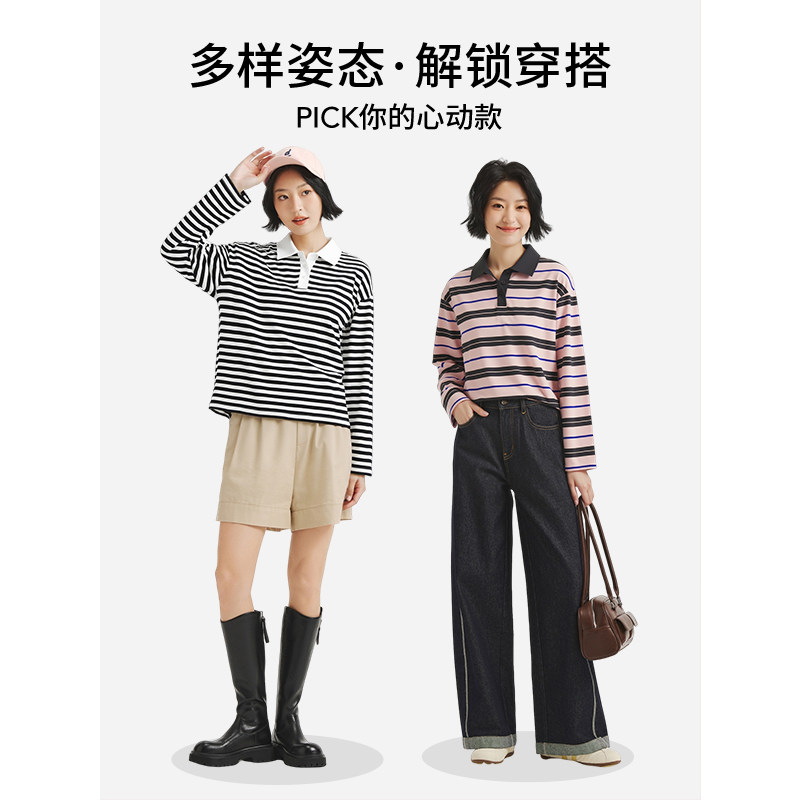 热风2026年春季新款女士翻领宽松条纹长袖T法式简约风