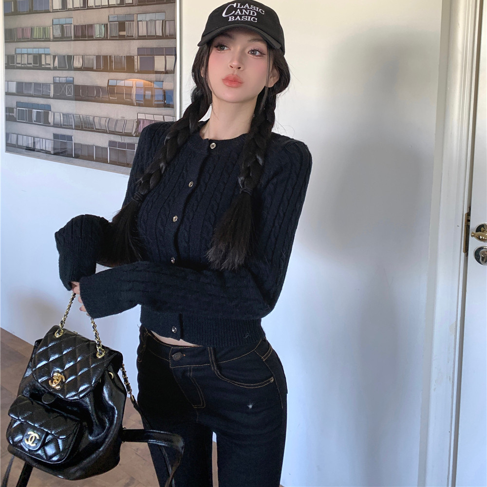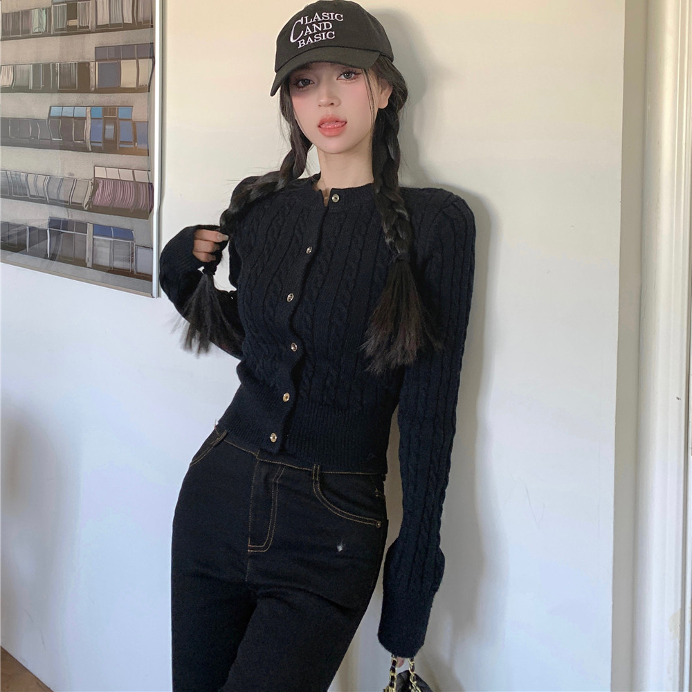 港味风格麻花针织开衫女春秋新款短款修身显瘦毛衣外套长袖上衣