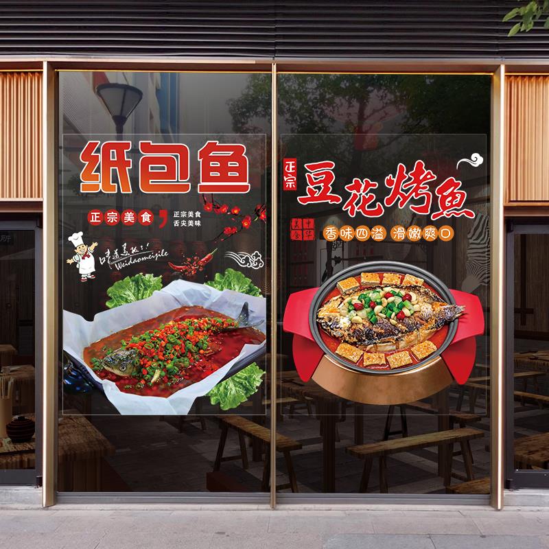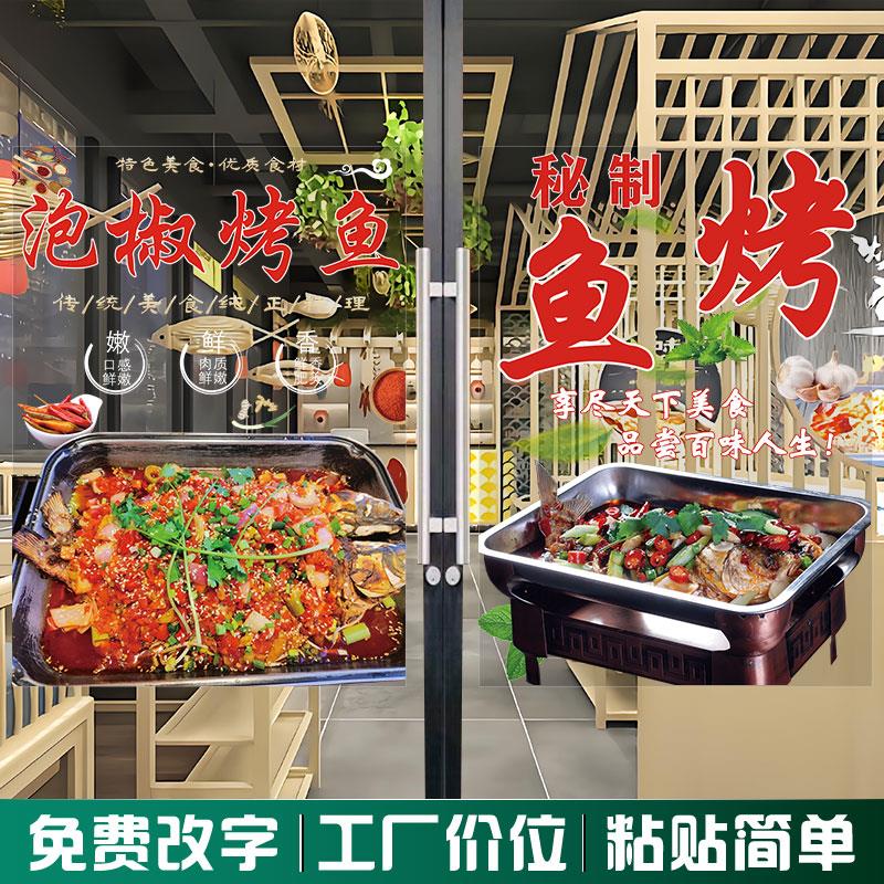 烤鱼店玻璃橱窗门贴纸夜宵饭店餐馆广告宣传装饰海报防撞双面图案