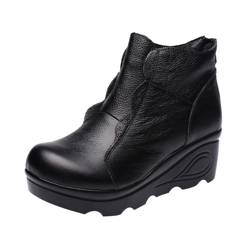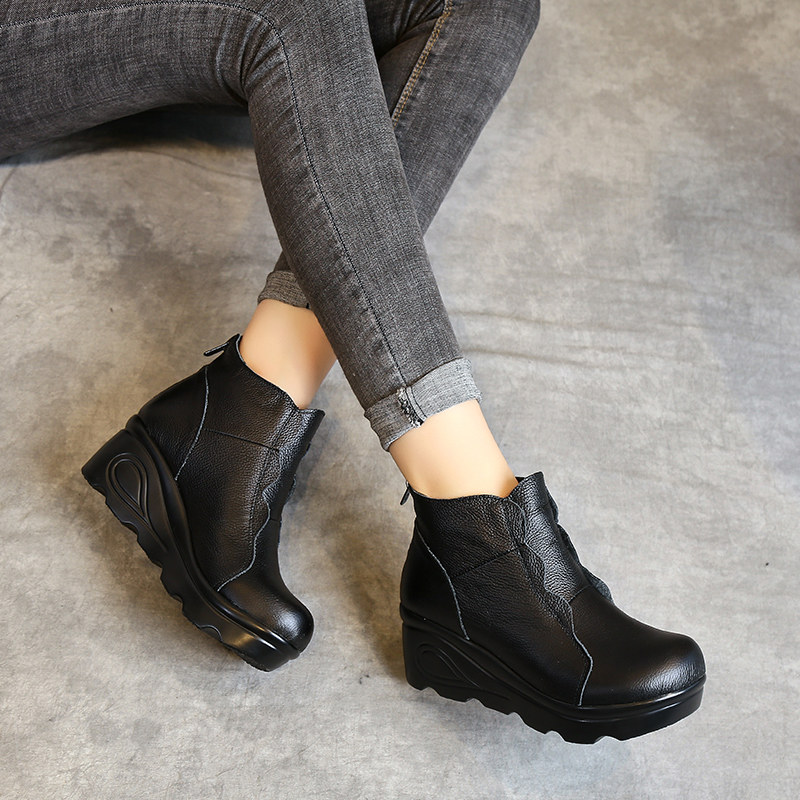 2019秋冬新款真皮厚底短靴女松糕底文艺风复古休闲防水台坡跟女靴