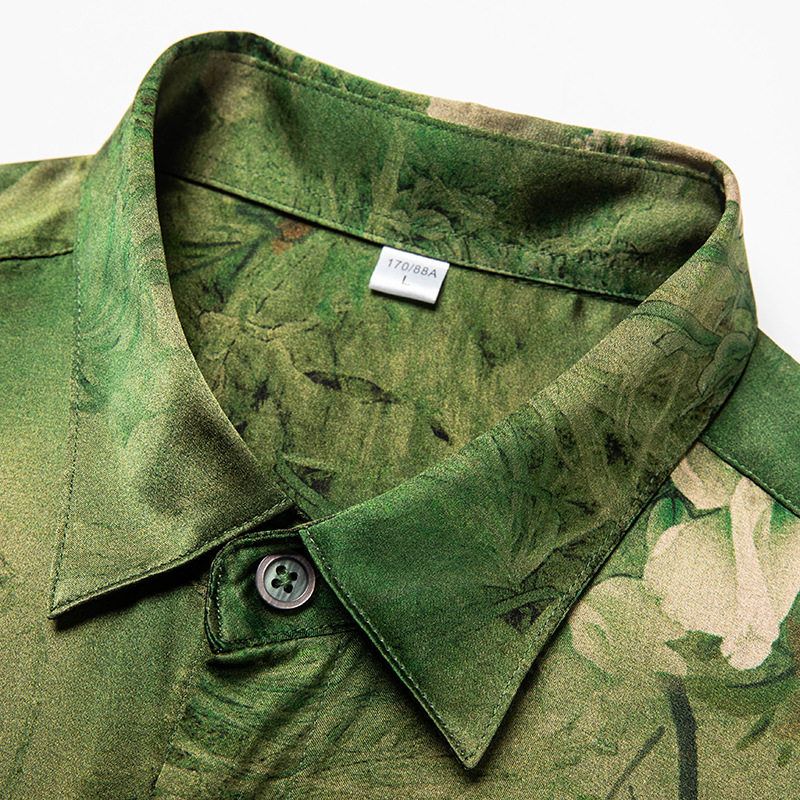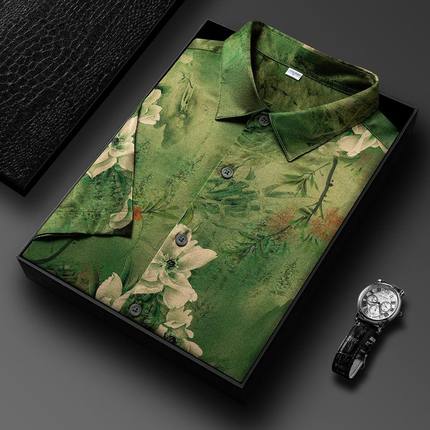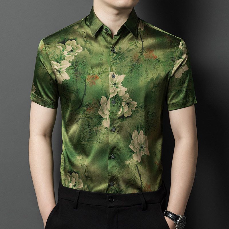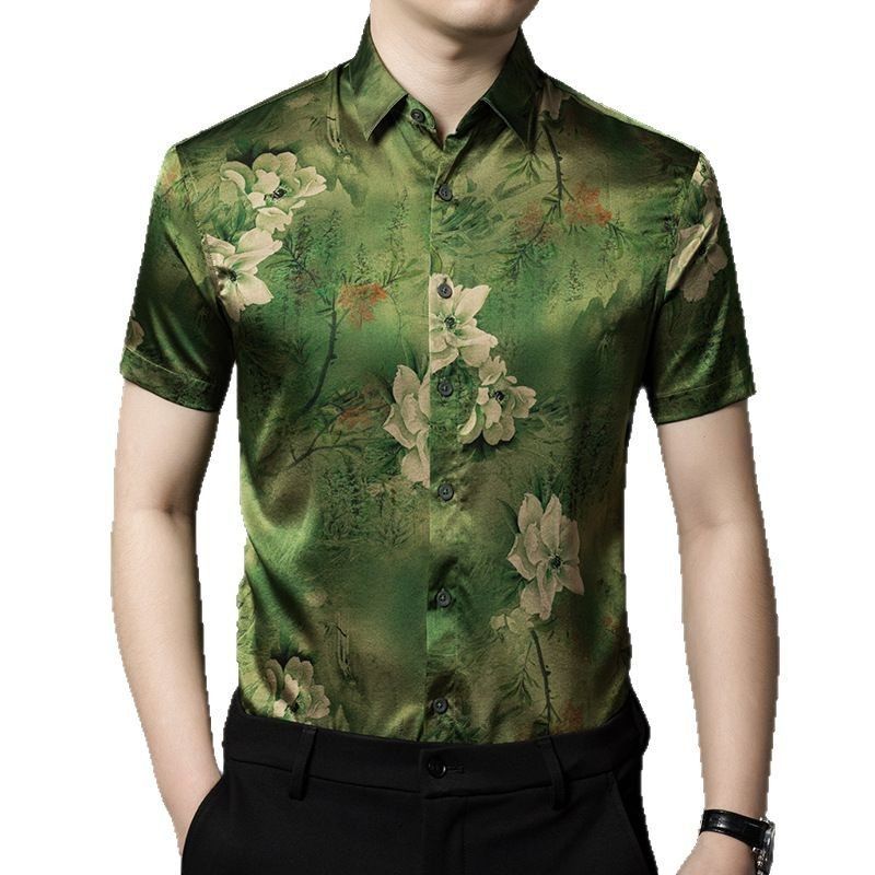 夏季新款男士桑蚕丝衬衣男薄款透气男装中青年休闲短袖真丝衬衣男