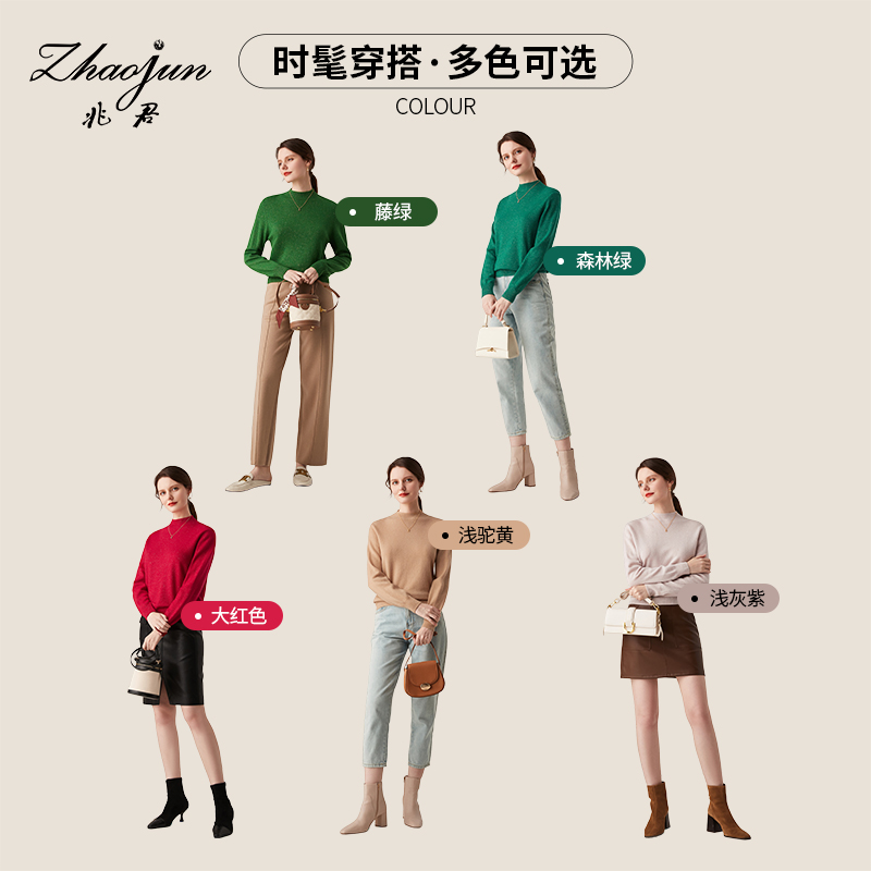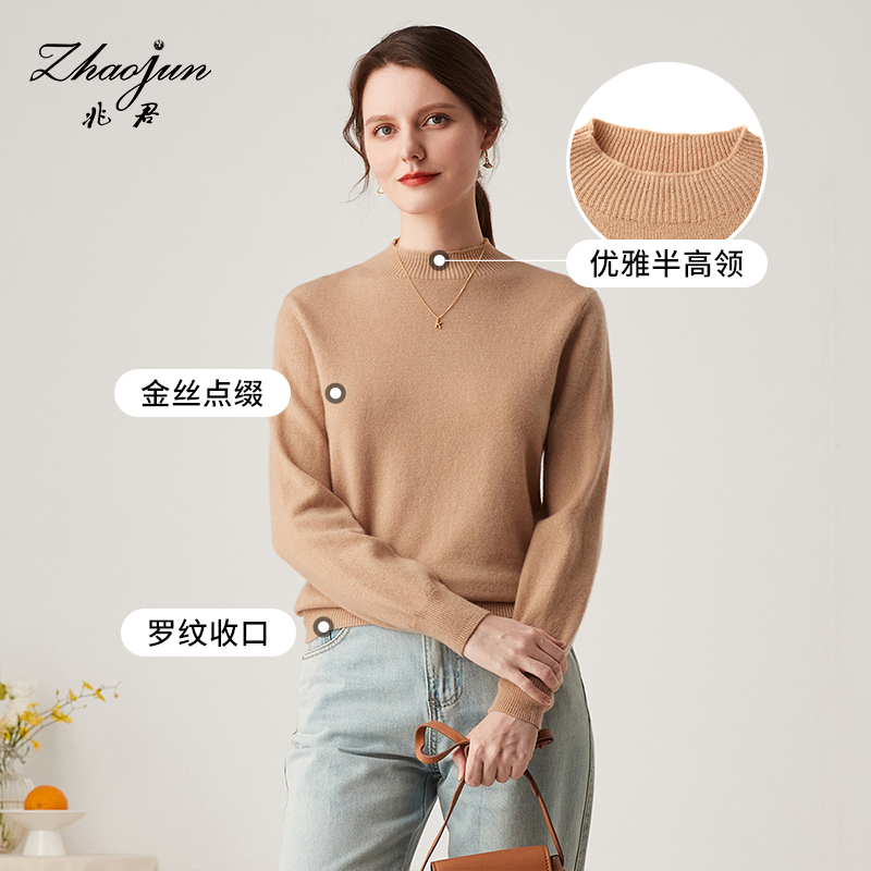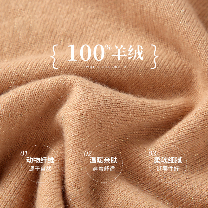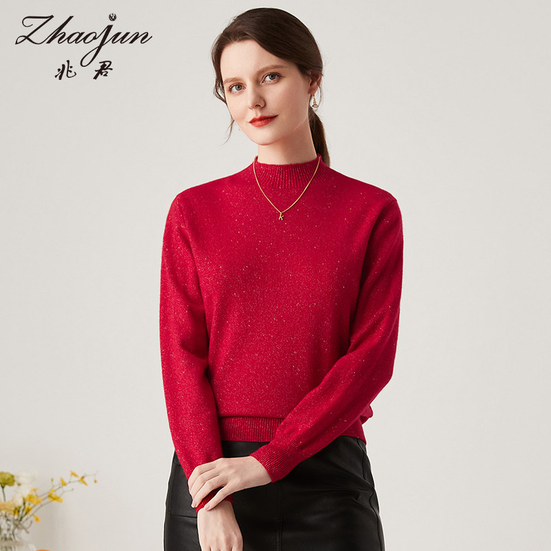 兆君秋冬新款半高领长袖羊绒衫女纯色金丝点缀针织红色毛衣