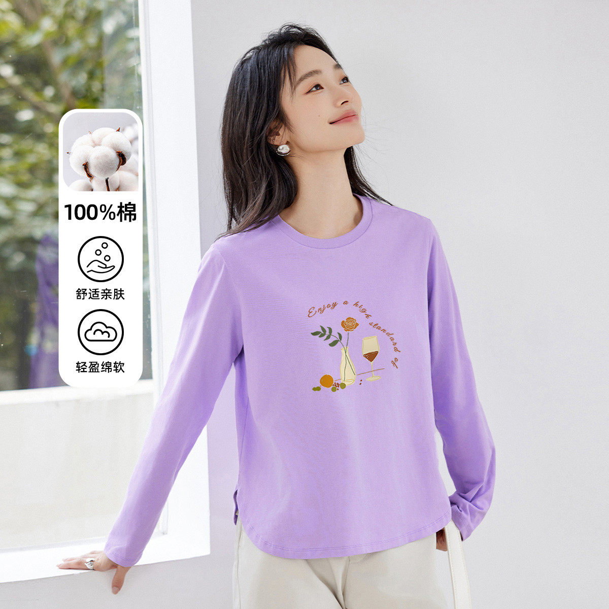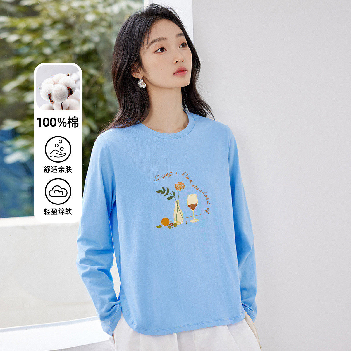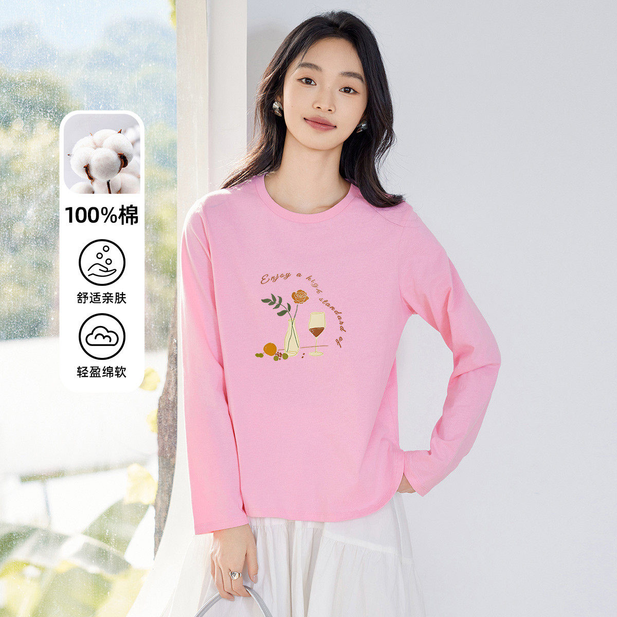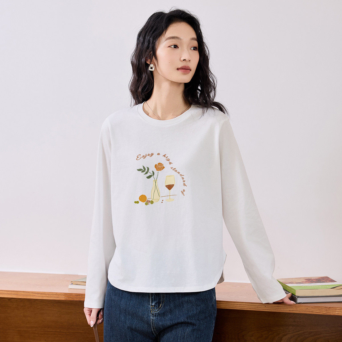 茵曼2026春季新款纯棉长袖T恤女正肩白色修身显瘦打底衫上衣爆款