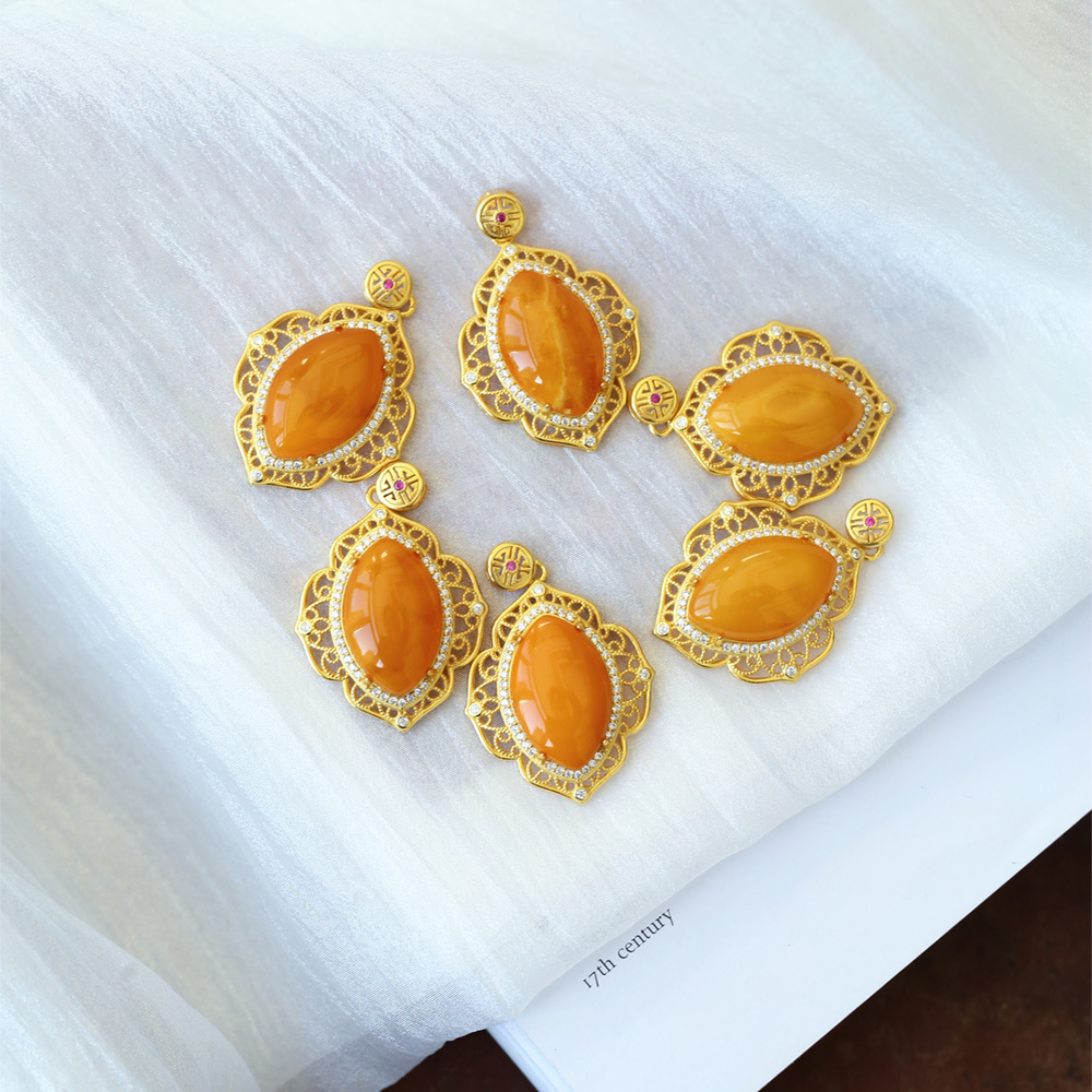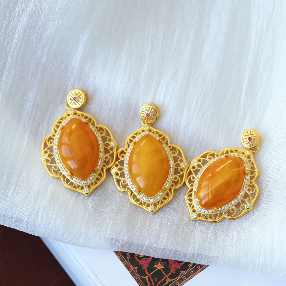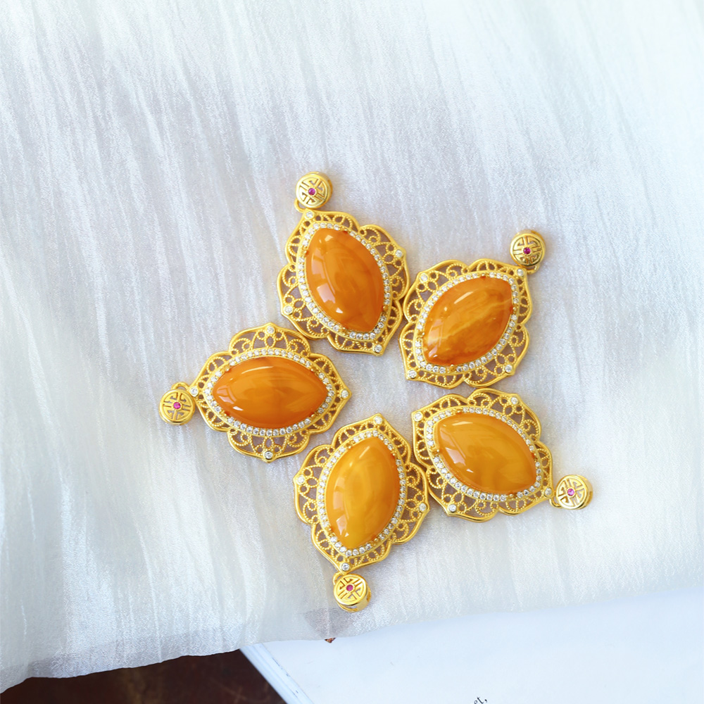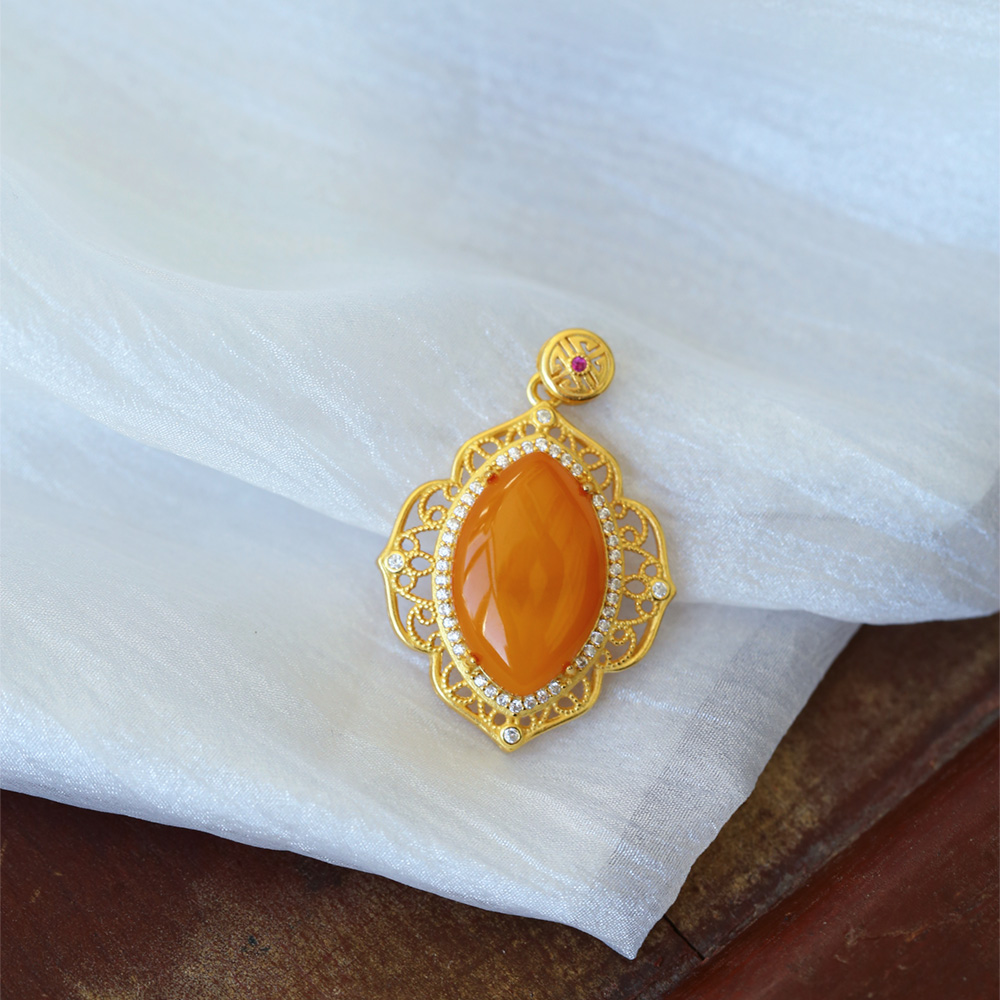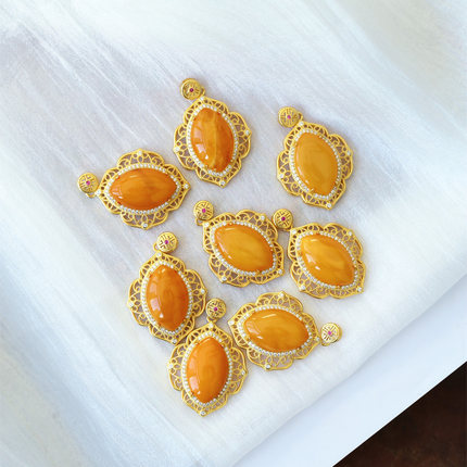 精工托镶嵌 天然蜜蜡鸡油黄蛋面纯银镶嵌款吊坠 女款琥珀挂坠饰品