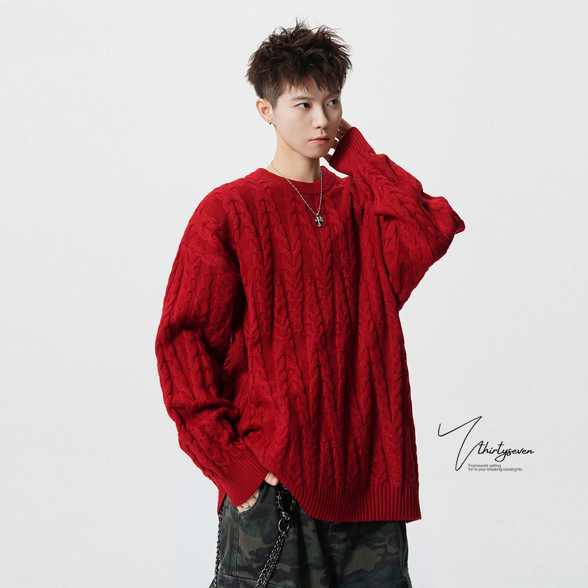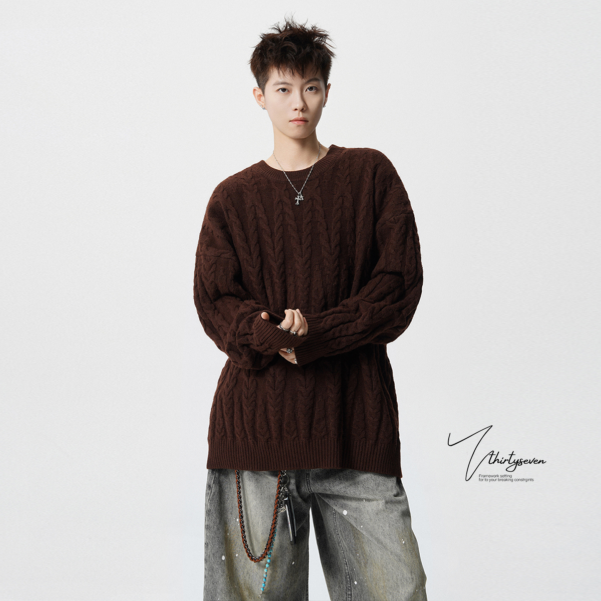 V37美式复古麻花毛衣男款秋季潮牌宽松慵懒风针织衫圆领套头线衣