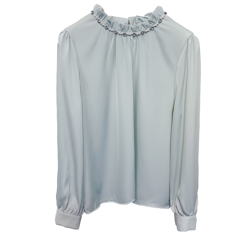 珍珠镶钻立领醋酸缎面衬衫女春秋新款气质职业雪纺衫打底衬衣上衣