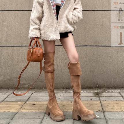 过膝长筒靴棕色靴子厚底8CM美拉德显瘦两穿粗跟高筒骑士靴女秋冬