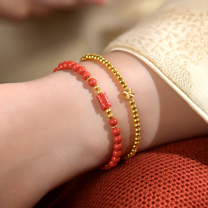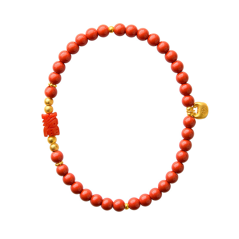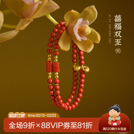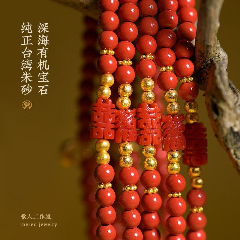 觉人台湾纯正朱砂手串雕刻喜福深海宝石18K黄金锁手链[囍福双至]G