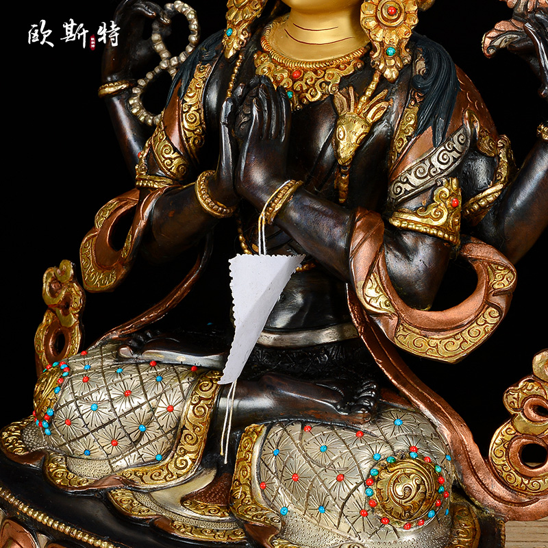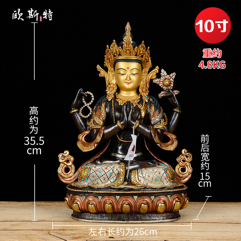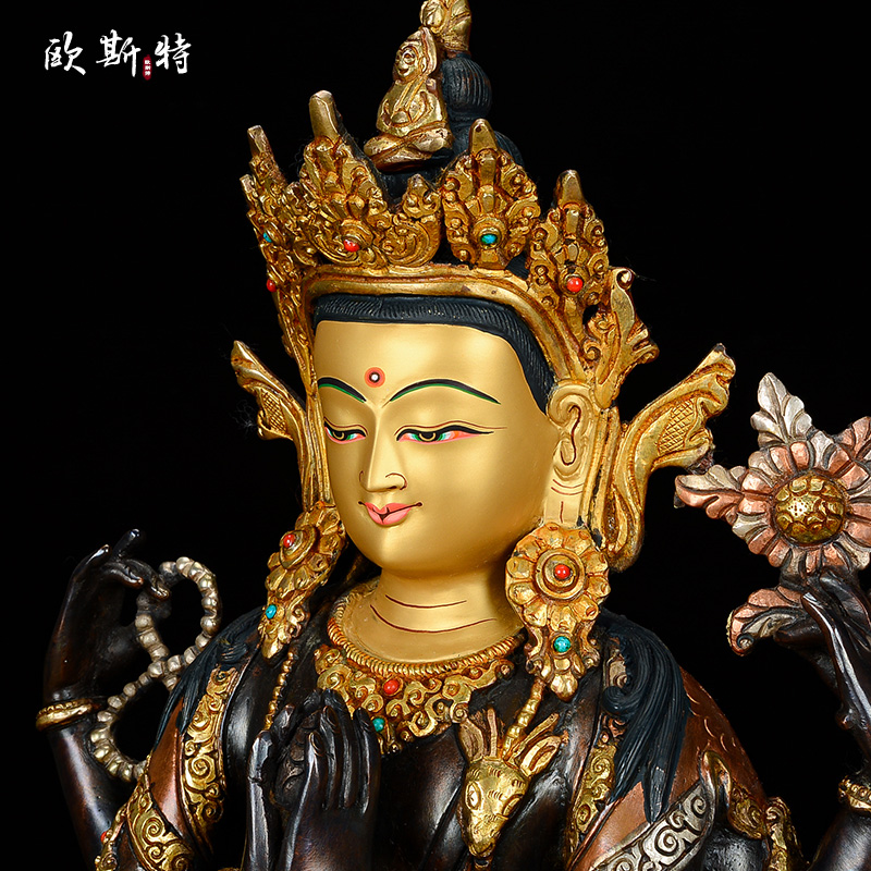 欧斯特 四臂观音铜像 尼泊尔进口铜镀金手工雕花客厅中式摆件10寸