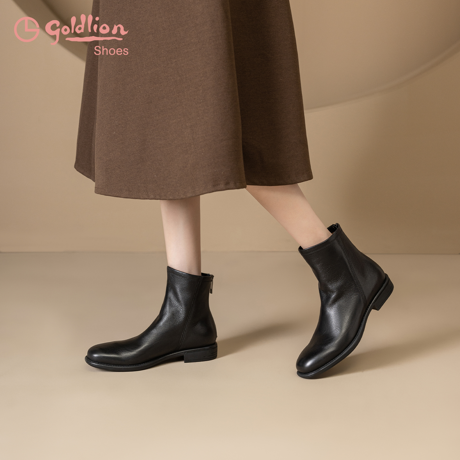 金利来女鞋2024秋冬新款时尚圆头低跟黑色百搭时装短靴女真皮拉链
