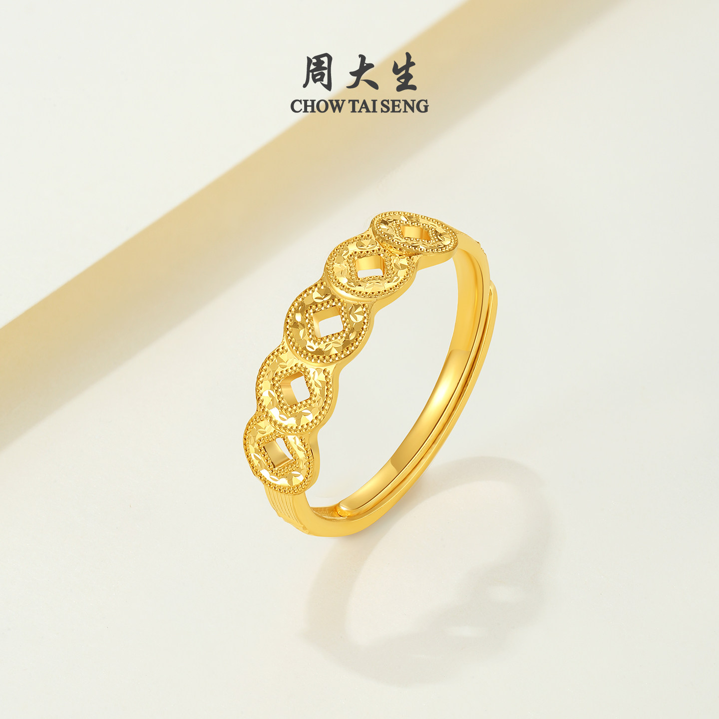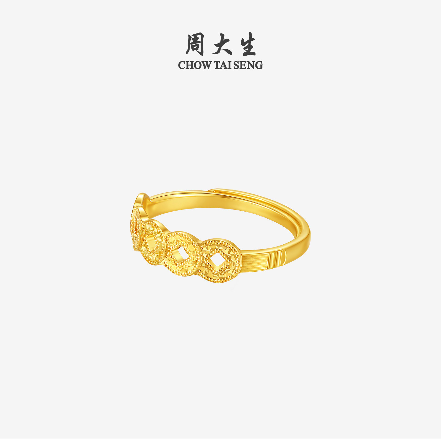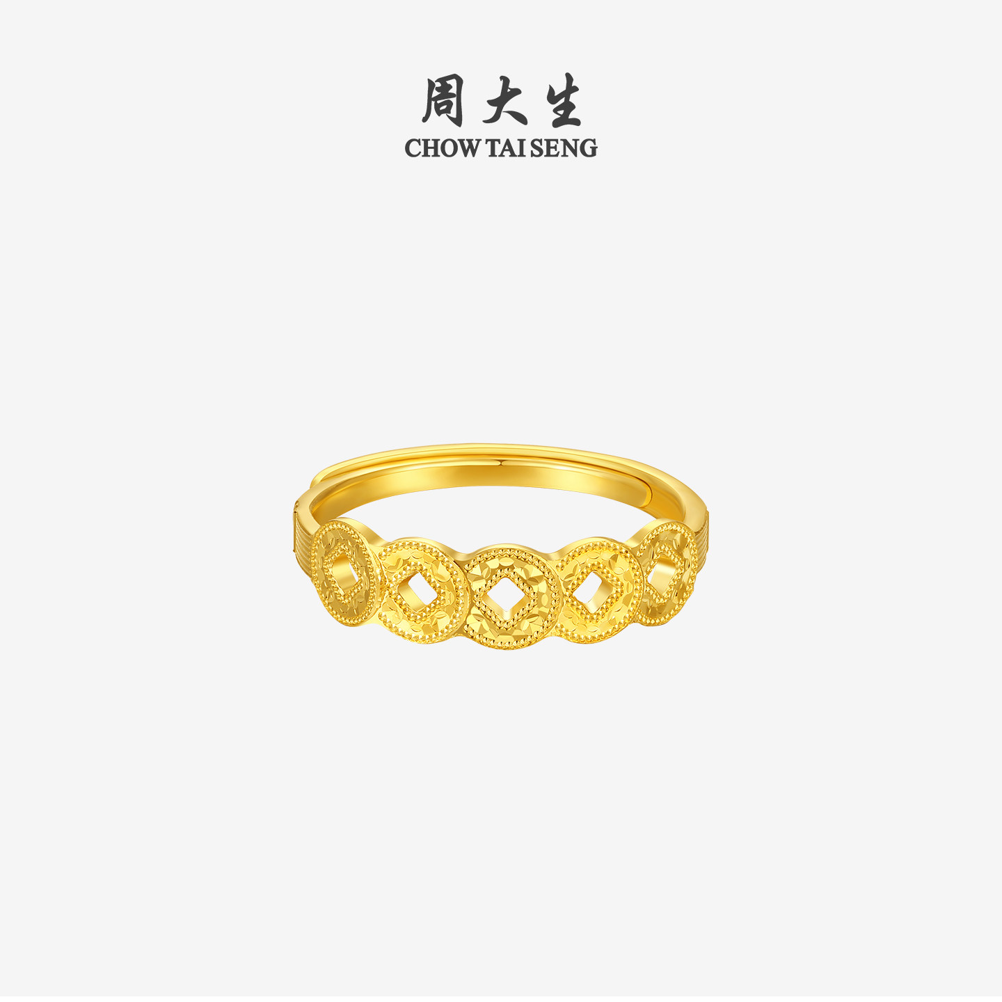 圣诞礼物周大生五帝币黄金戒指女足金爆闪铜钱手饰活口指环送女生