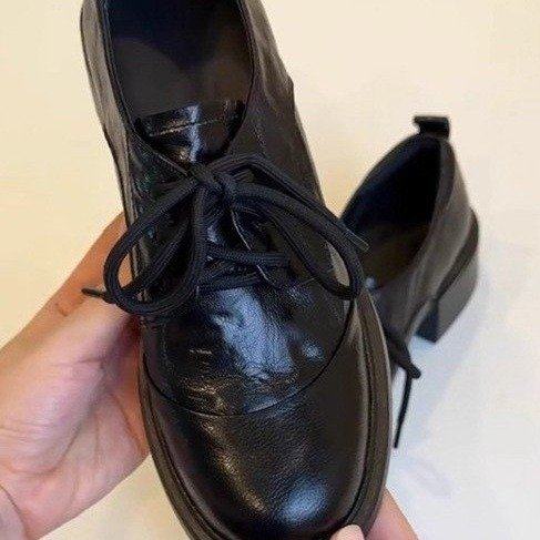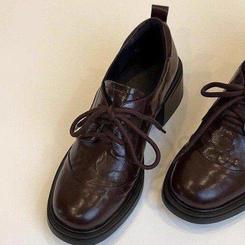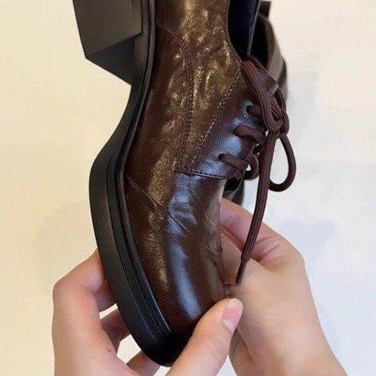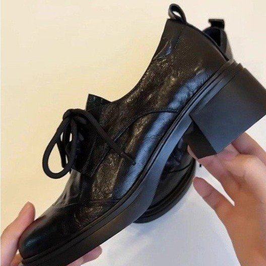 欧洲站~英伦风复古漆皮圆头系带乐福鞋通勤百搭粗跟小皮鞋女单鞋