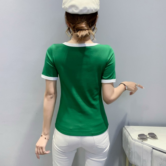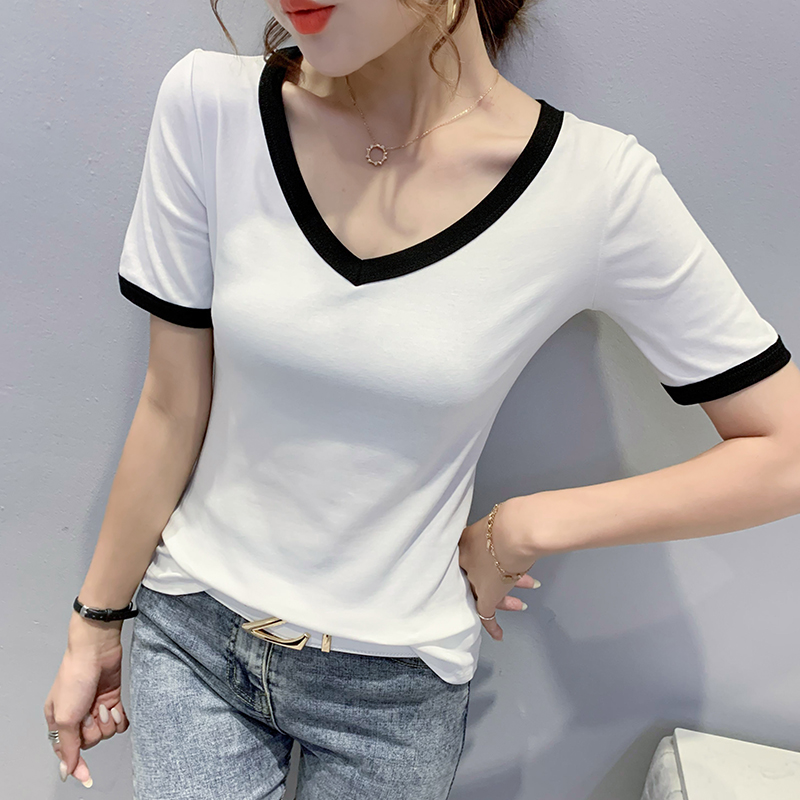 2024夏装新款时尚撞色V领T恤女短袖纯棉修身百搭半袖体恤小衫上衣