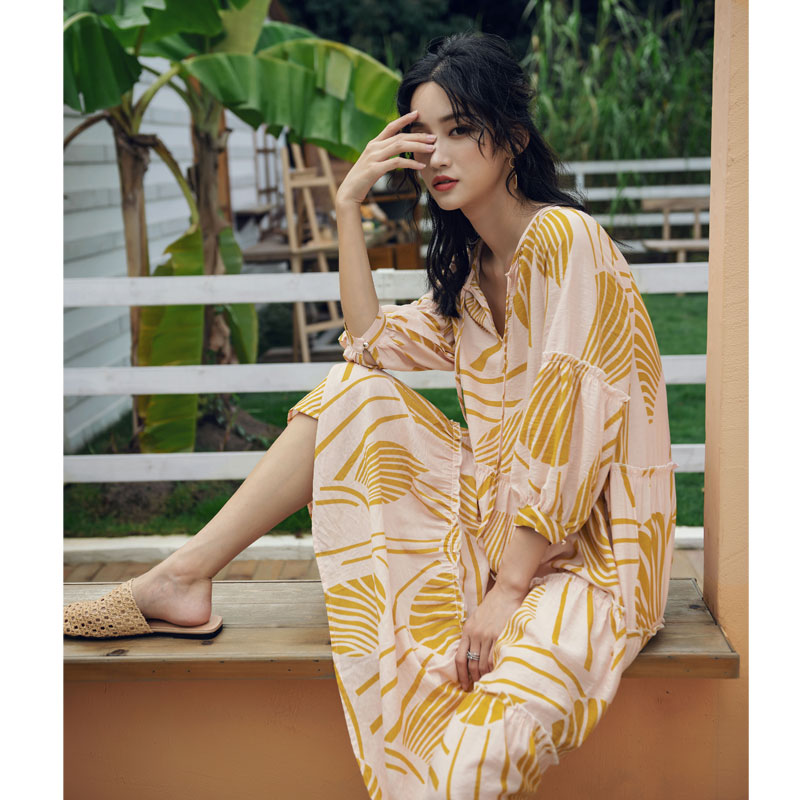 超仙气沙滩裙海边度假法式复古泡泡袖连衣裙女三亚小心机碎花长裙