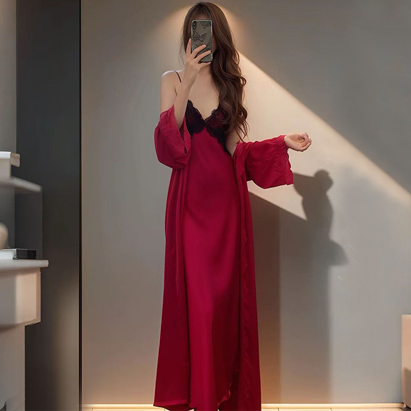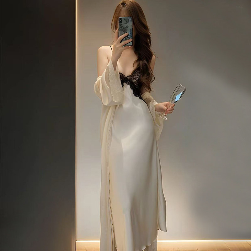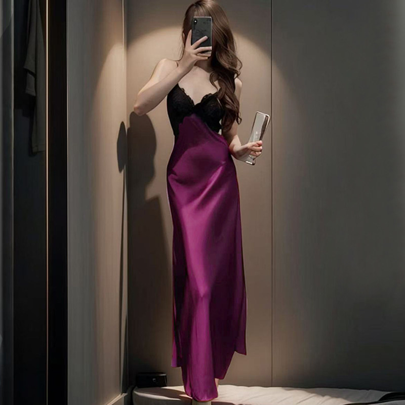 性感冰丝睡衣女春秋季长款带胸垫吊带睡裙夏天纯欲风蕾丝长裙长袍