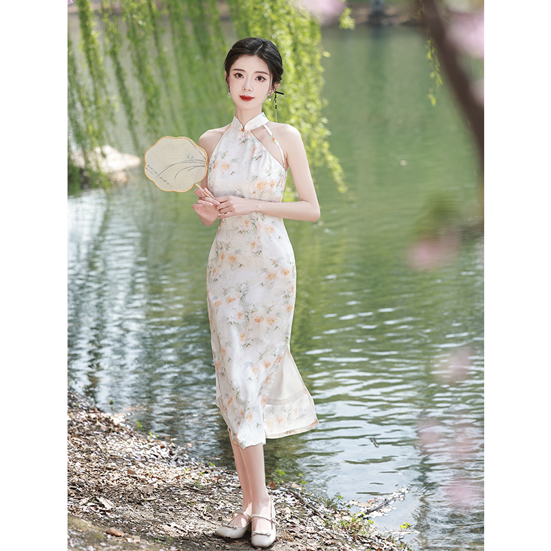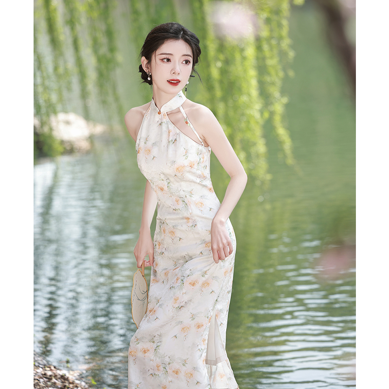 性感挂脖旗袍国风碎花新中式改良连衣裙女年轻款甜辣修身显瘦长裙