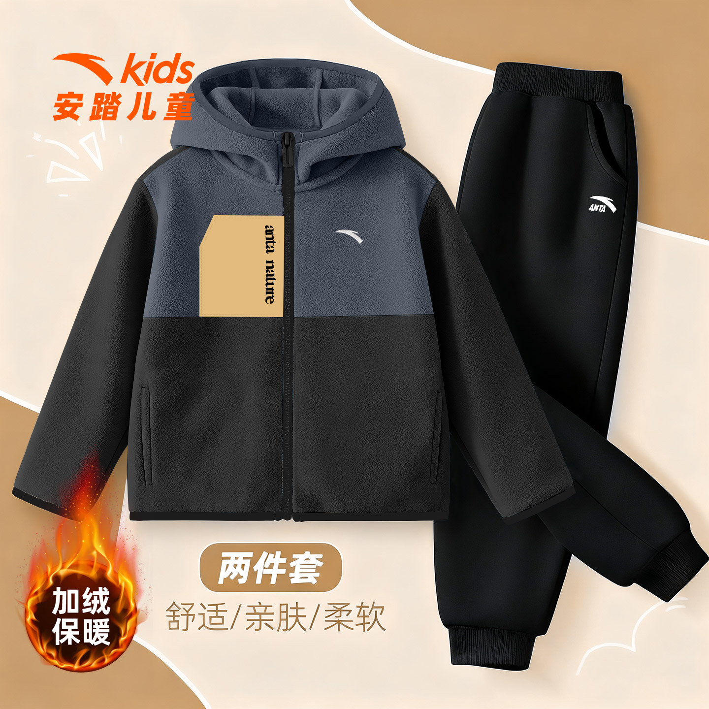安踏儿童休闲套装男大童2025秋冬季新款摇粒绒外套长裤加绒运动服