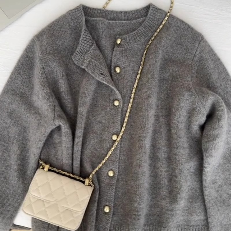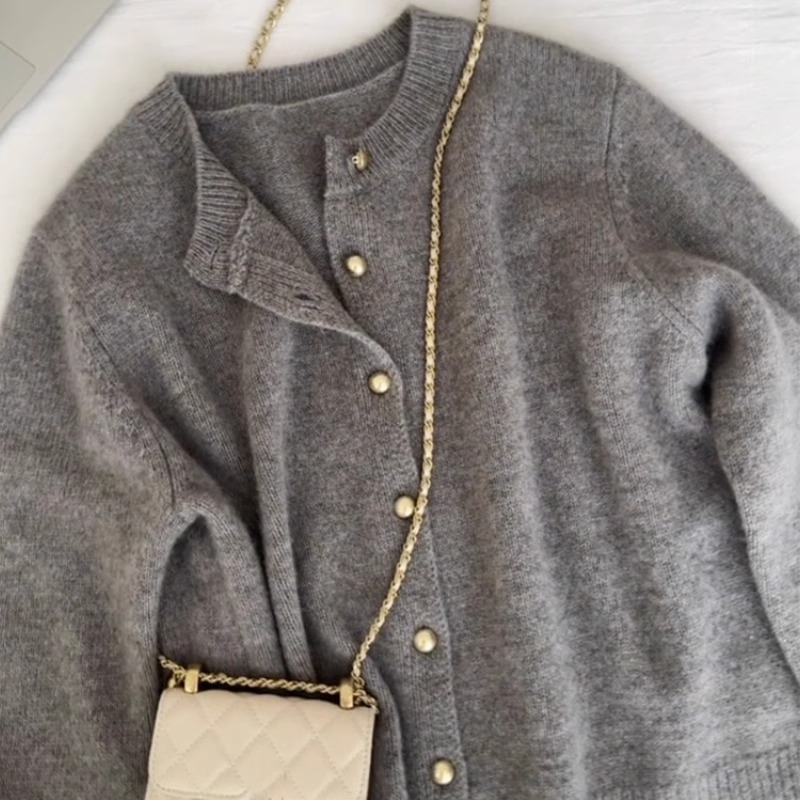 2024秋冬新款圆领灰色针织开衫毛衣女复古羊绒气质小金扣开衫毛衣